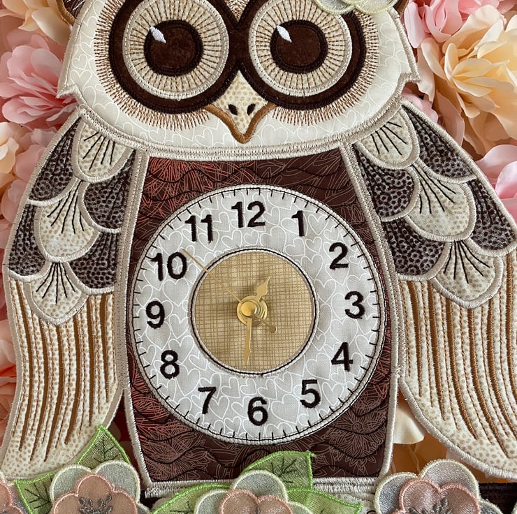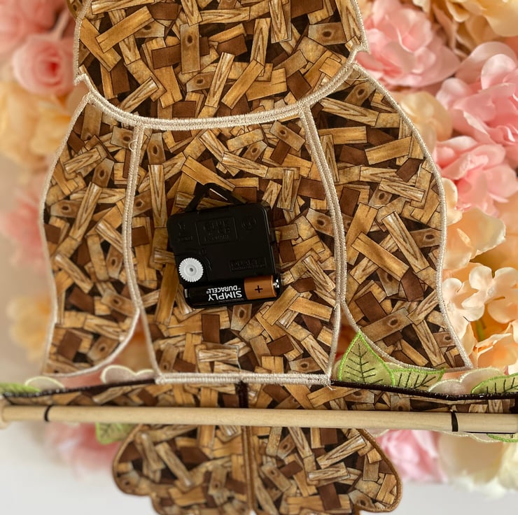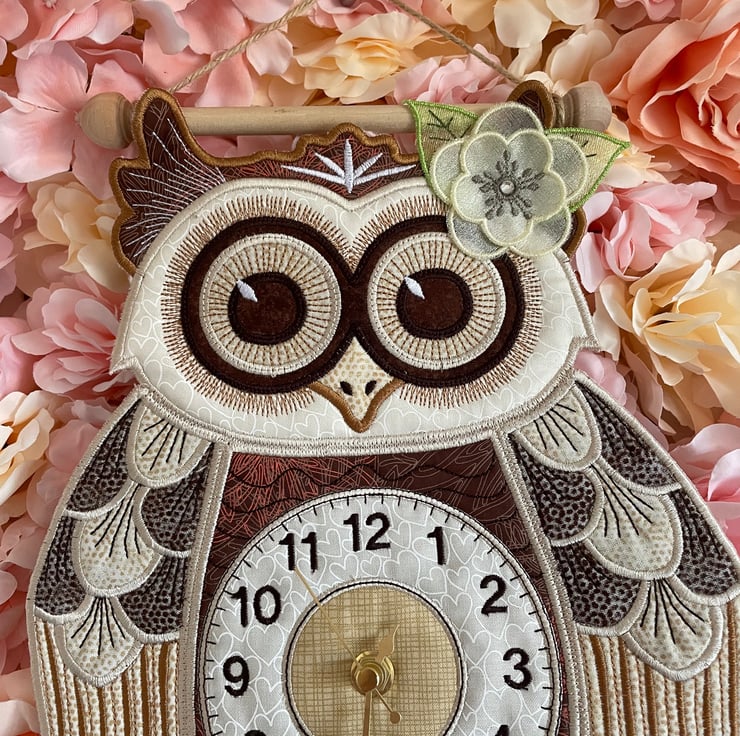 This chirpy owl has been made out of brown, beige and cream cotton fabric. Thermolan wadding. Backed with a wood print design. Appliqués with organza flowers with diamanté centres and leaves to embellish. Stitched on my embroidery machine. Wood downing with finial ends to the top and bottom of the design. String attached for hanging on a picture hook or cup hook.