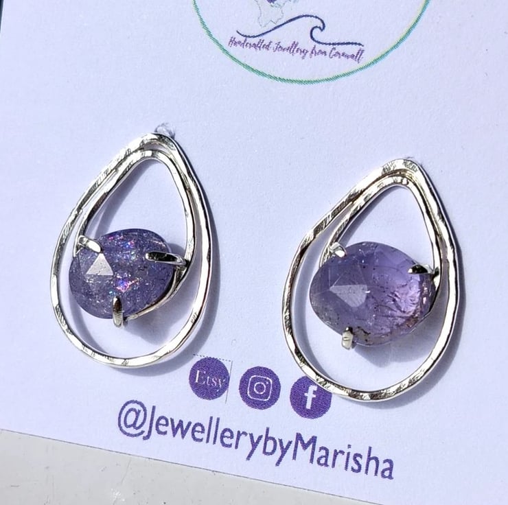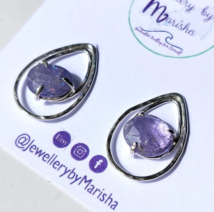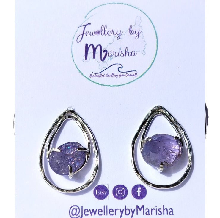 Handmade Recycled Sterling Silver 925 & Tanzanite Double Teardrop Stud Earrings