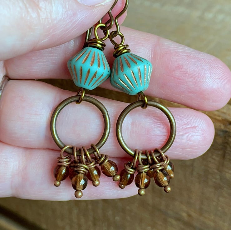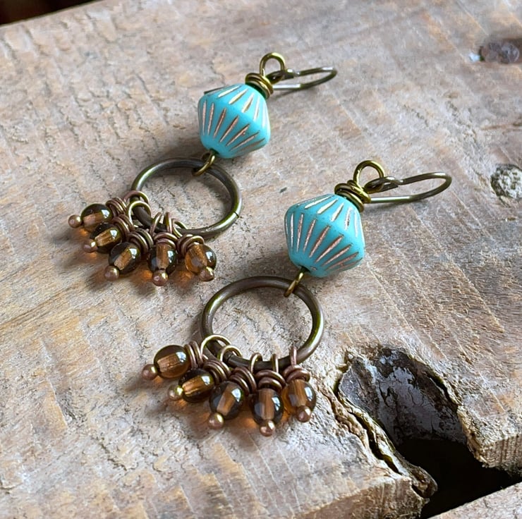 Below, I have added a cluster of smoked topaz Czech glass rounds. These tiny beads have been carefully wrapped onto copper ball headpins and simply dangle from a brass ring, giving the earrings lovely movement.
