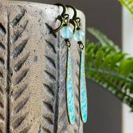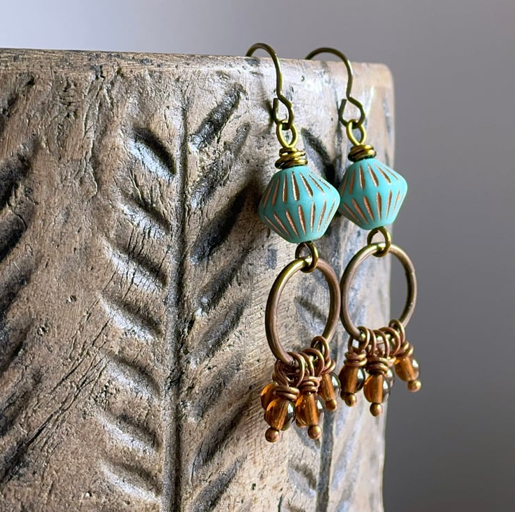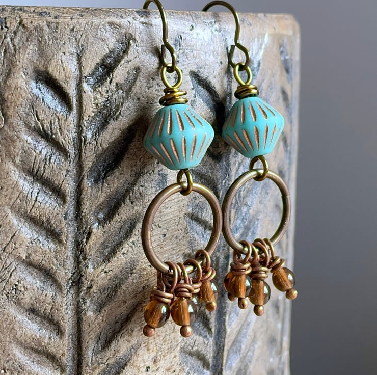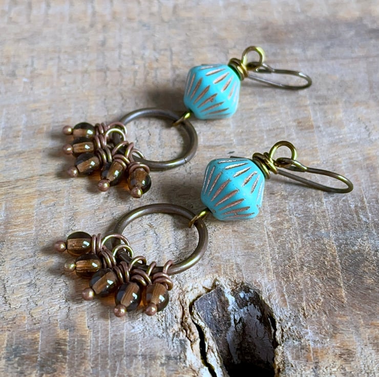 They feature large Czech glass bicone beads in a matte shade of turquoise with a rustic copper wash in their grooves.