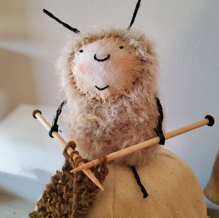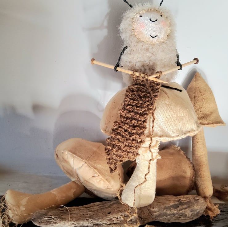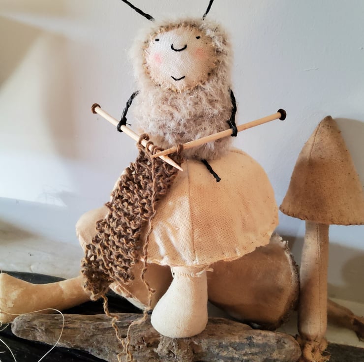 The little bug is made from mohair with a linen face and the antennae ,legs and arms are made from painted jute. The knitting needles are made from bamboo and tiny wooden beads. The mushroom has been made from linen with seed stitches all over the cap and then it has been gently tea dyed. The whole ensemble has been attached to a piece of driftwood.