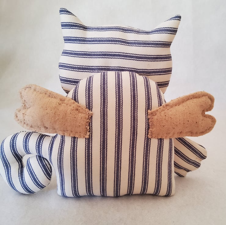Fairy/Angel cat is made from mattress ticking cotton fabric with embroidered features and flushed cheeks ( all that flitting about is hard work ). The legs have been button jointed to the main body with vintage buttons and allows the cat to free stand. The little wings are made from tea dyed linen ( there hand to be tea or coffee somewhere ) !
