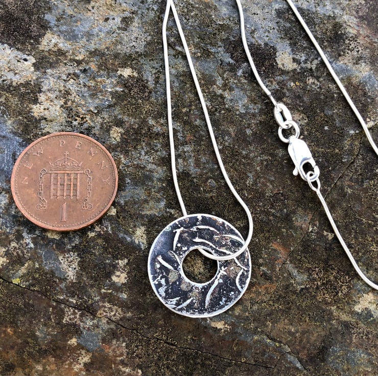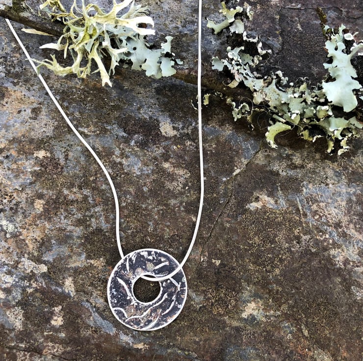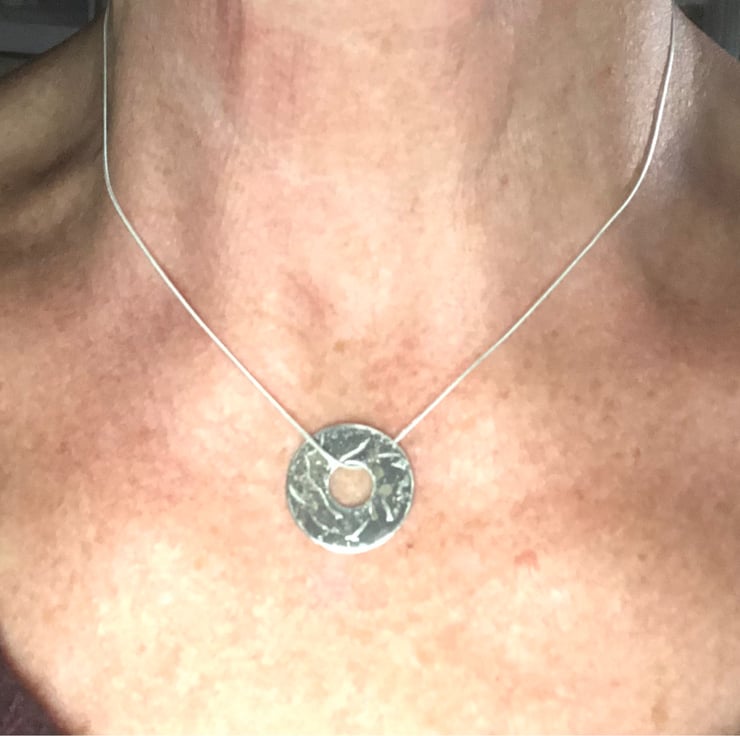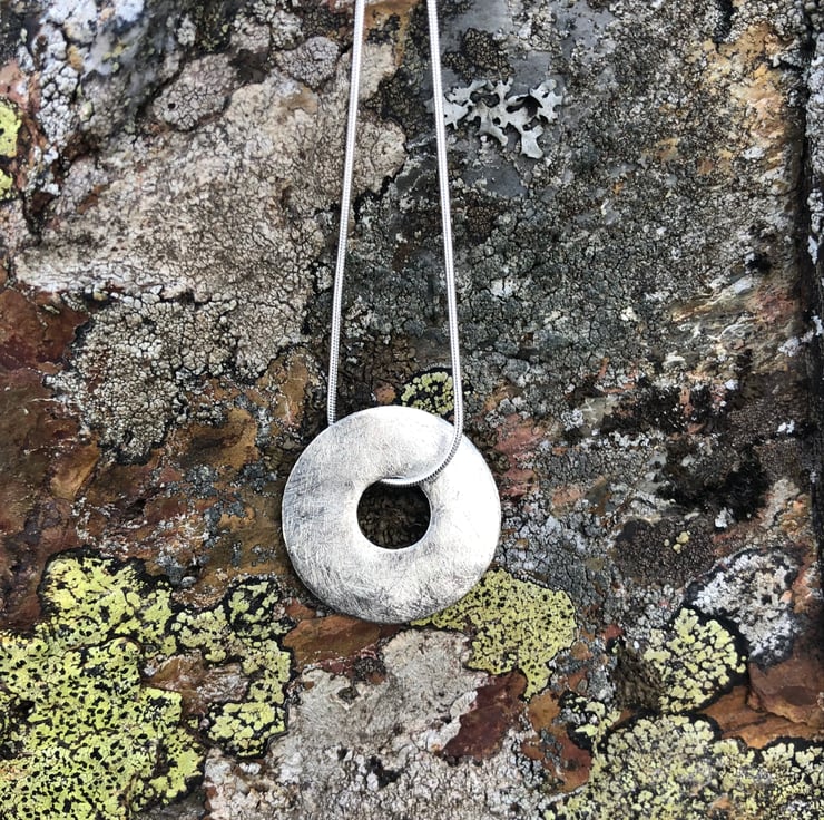 A simple silver textured circle pendant hanging from a fine sterling silver , good quality snake chain . You can choose from an 16 inch/40 cm chain, an 18 inch/ 45cm length or a 20 inch/ 50 cm length.