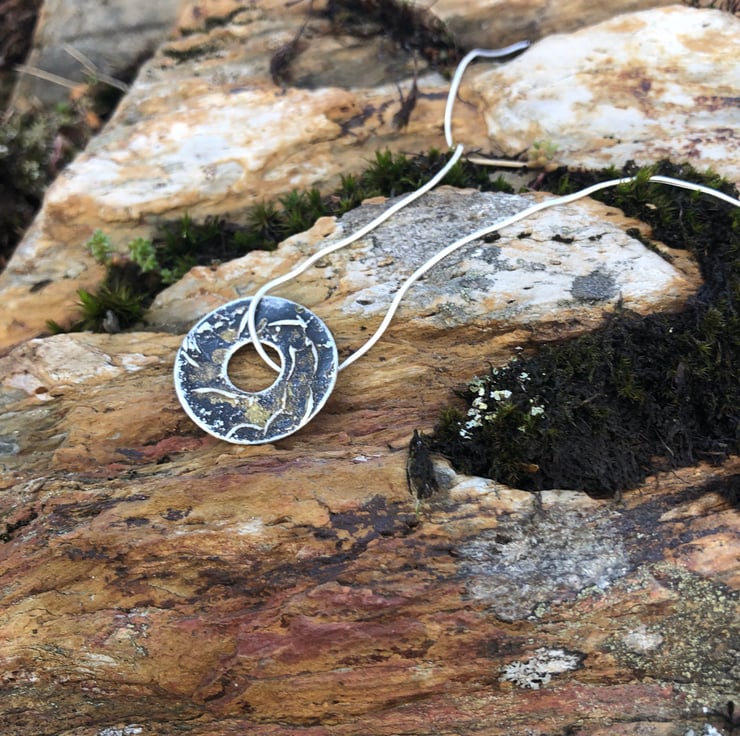 It flips over , sometimes by itself, to show the other side, which is silvery with a flat, frosted texture. The textured side has been achieved with bits of left over silver which is highlighted with oxidisation . Each side is in contrast to the other.