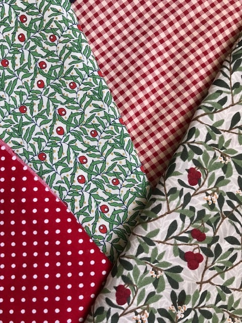 I have chosen a combination of traditional red polka dot and gingham fabrics and mixed in some gorgeous 'Holly Berries' patterned material from Liberty, and 'Winter Berry' fabric from V&A for William Morris.