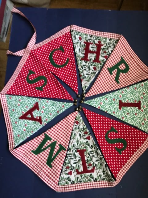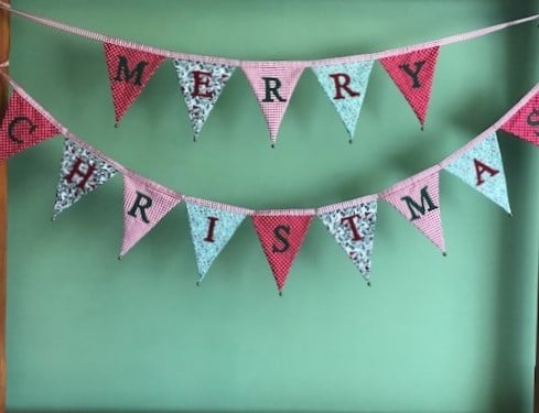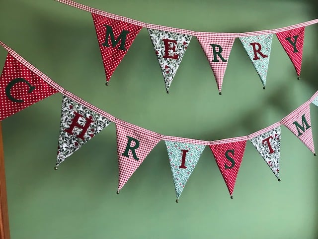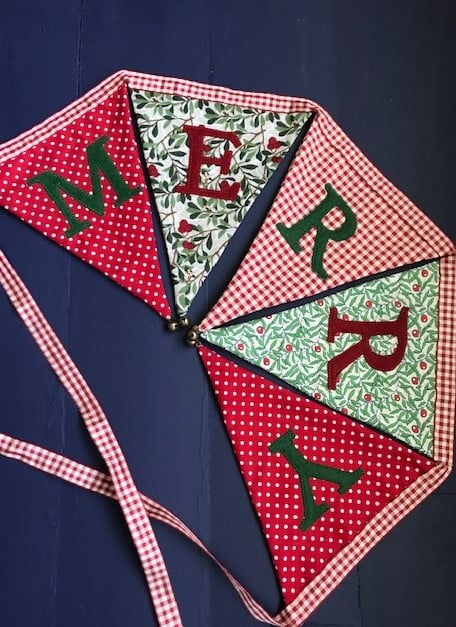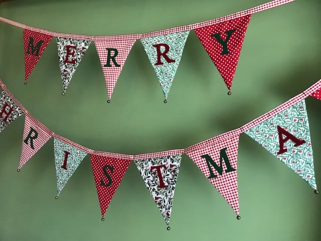 The words ‘Merry Christmas’ have been hand cut from alternating red and green felt and then machine stitched in place. The flags have been sewn onto co-ordinating red and cream gingham ribbon and each flag has a tiny brass bell hand-stitched onto each point. Not just decorative, they really do gently jingle!