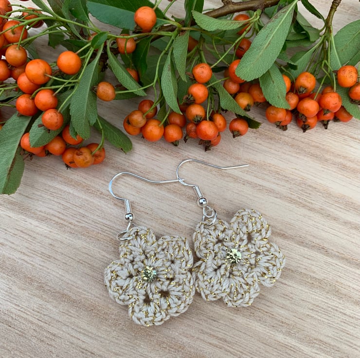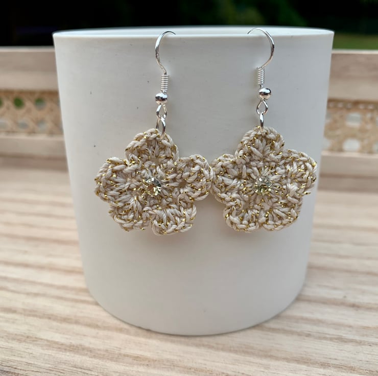 Gorgeously gold and Silver pretty handmade flower earrings, inspired by the 1960s flower power period. Measuring approx 4.5cm drop, made with metallic yarn and A grade Czech Crystal Montee Centres. 925 stamped silver ear hooks complete these Christmassy little earrings. I lightly stiffen my textile earrings so they hold their shape, this does not affect the sparkly finish.