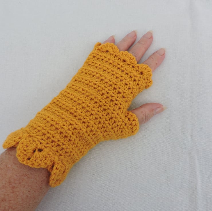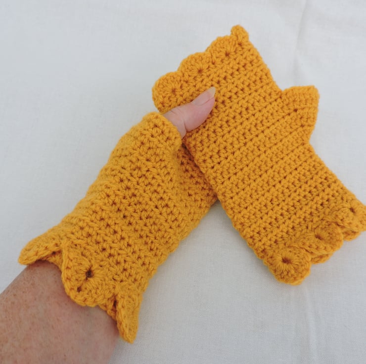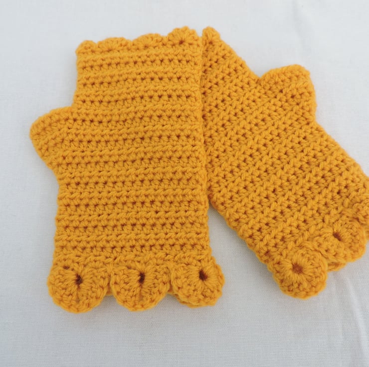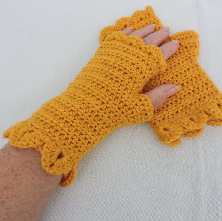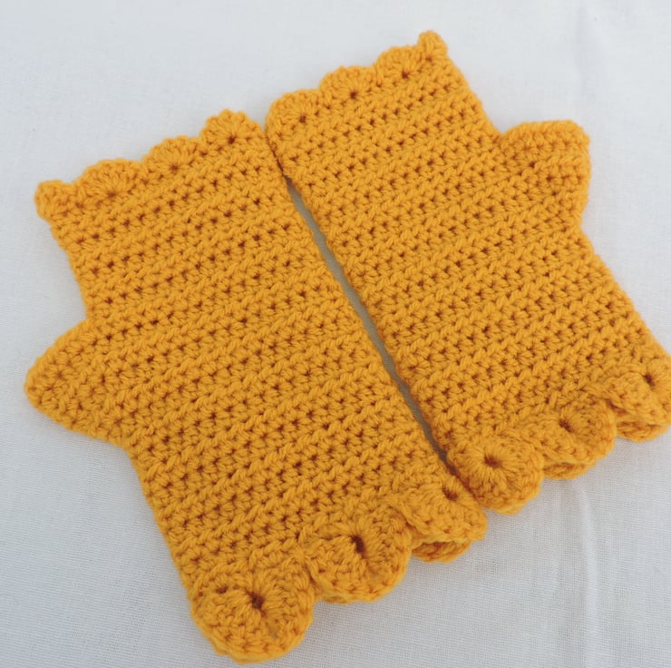 Sale now £5.00 Adults crocheted fingerless mitts which I have crocheted with a beautifully soft 100% premium acrylic yarn. A lovely sunshine yellow colour. These mitts have a plain body with a single row of dragon scales at the cuffs and a wavy edge to the top. An ideal winter warmer for those who like to keep their fingers free.