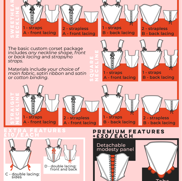 These Pick & Mix Corsets are created in collaboration with each customer. You get to decide the combination of design elements from the shape of the neckline to the length of the bodice even down to the colour and material of ribbons, binding and extra embellishments.