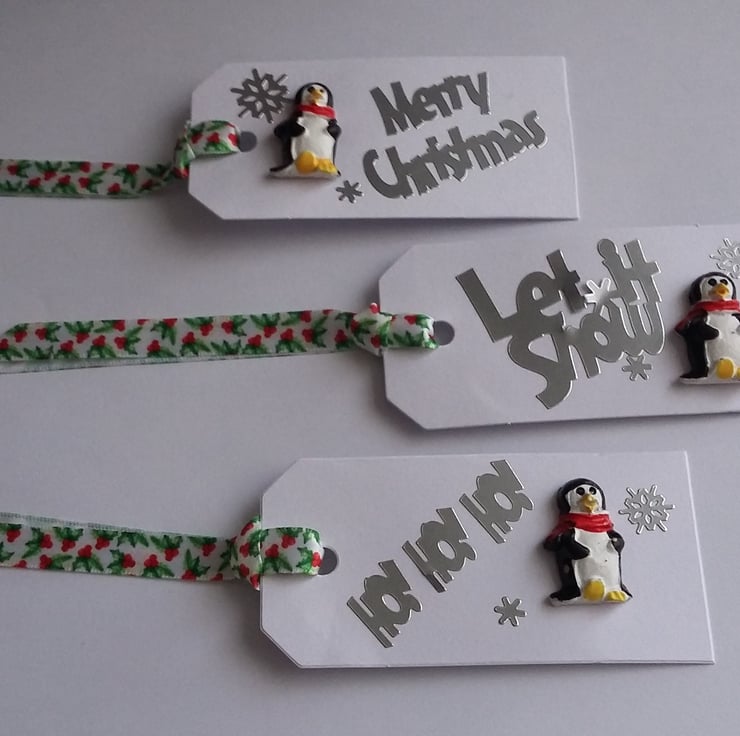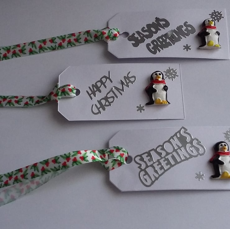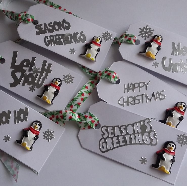 A SET OF 6 CHRISTMAS GITF TAGS WITH SEASONS GREETINGS AND PENGUINS