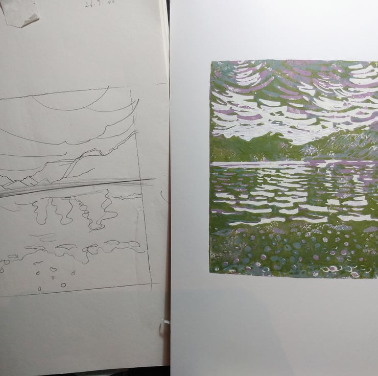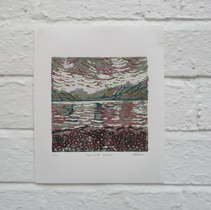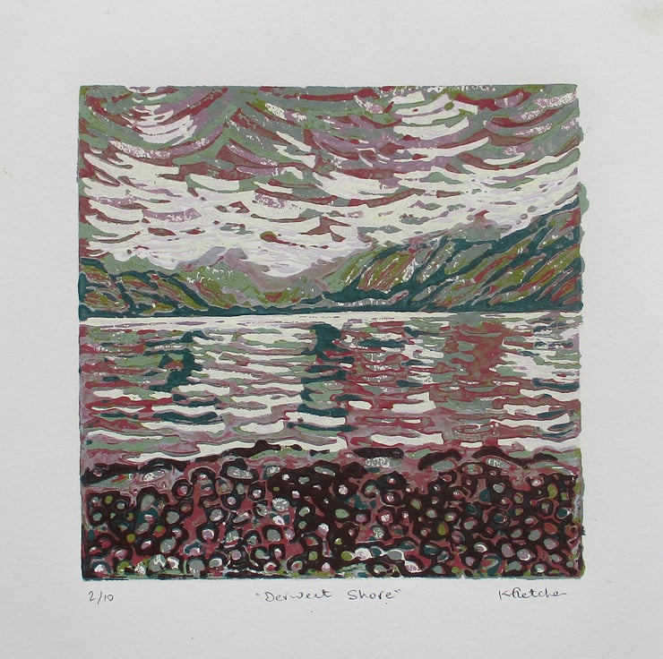 This is an original reduction linocut print of the shore of Derwentwater in the Lake District, looking across the lake towards the distant Cumbrian mountains.