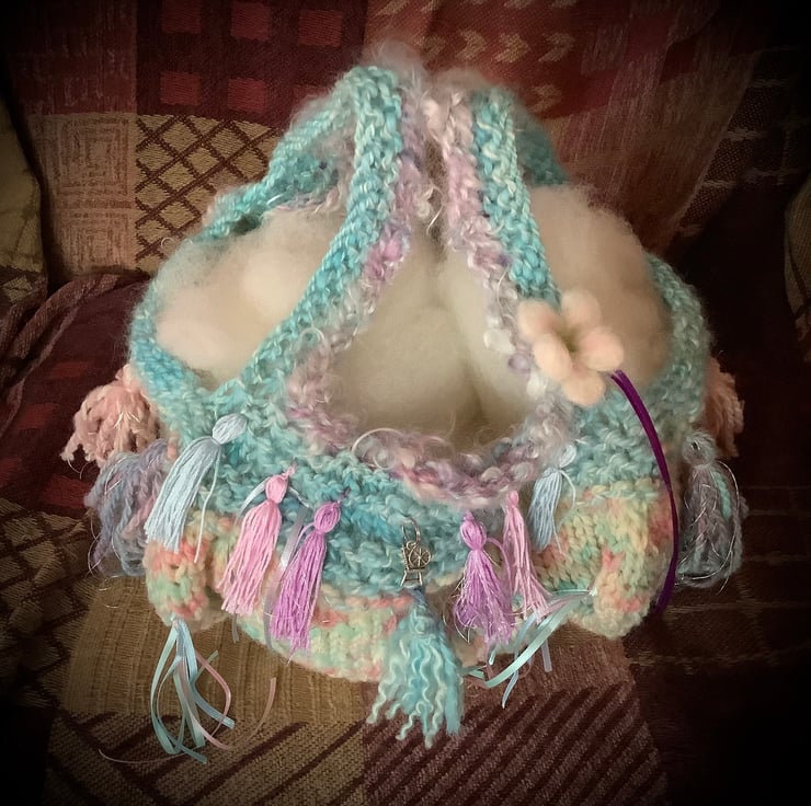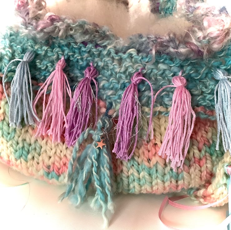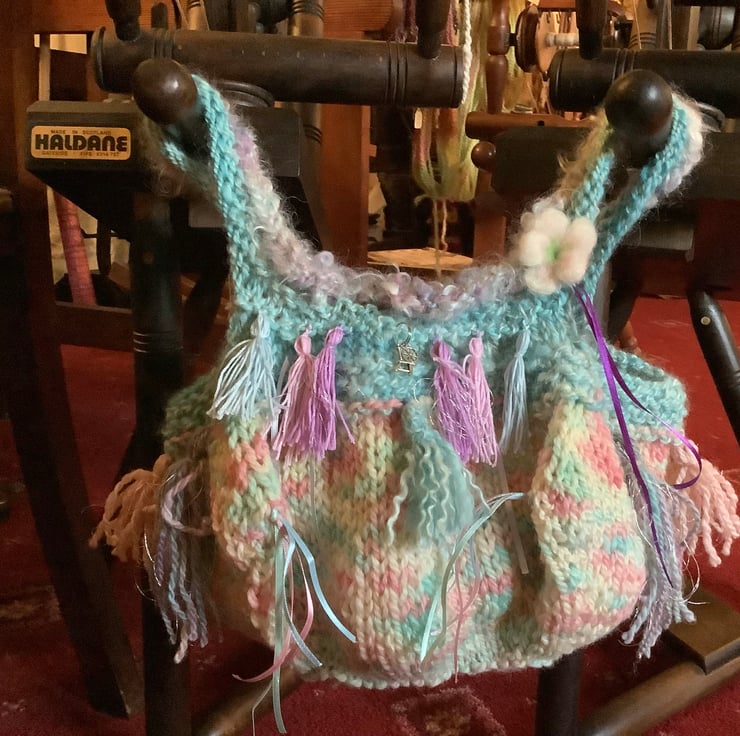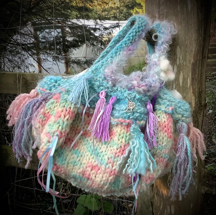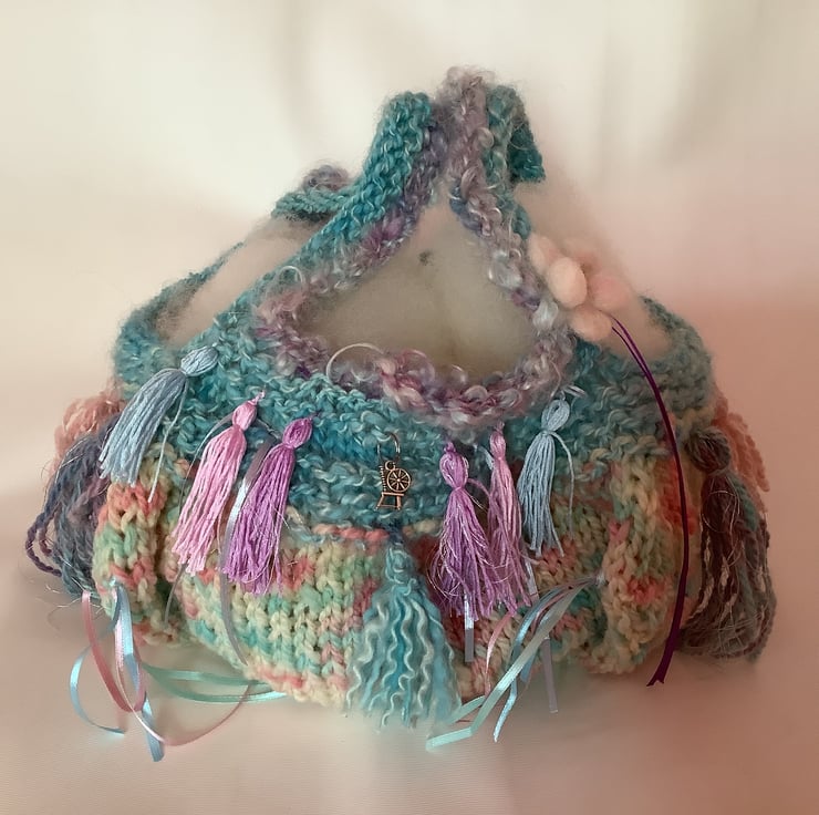 For the 'Candyfloss' bag I chose pastel shades - pinks, blues, greens and lilac with a darker purple ribbon for contrast. Look closely and you will find a spinning wheel charm ... a sign on the Scruffbagz of hand spun yarn. Being knitted, the bag is not rigid.