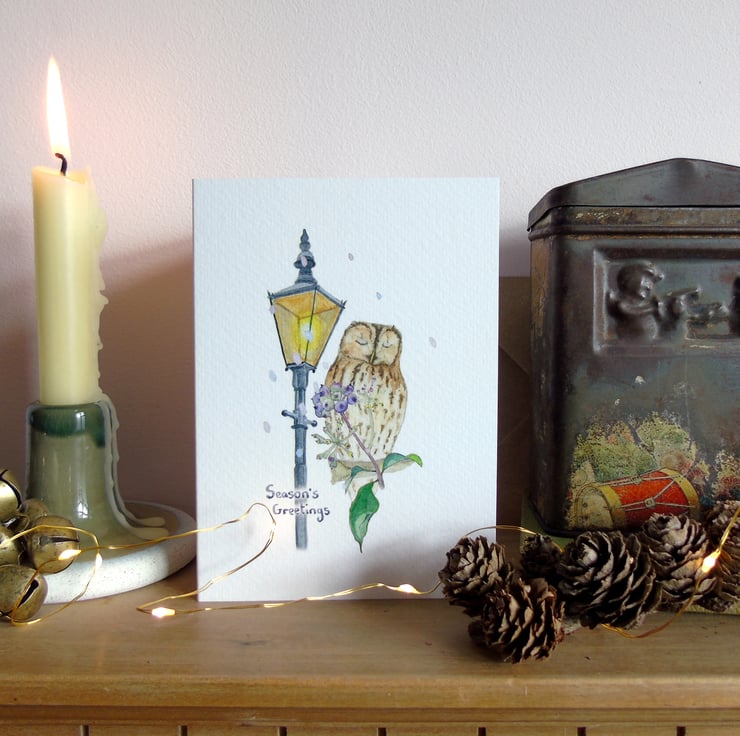 A magical Christmas card featuring my watercolour paintings of a tawny owl and Victorian street lamp printed onto tintoretto gesso card for a luxurious feel
