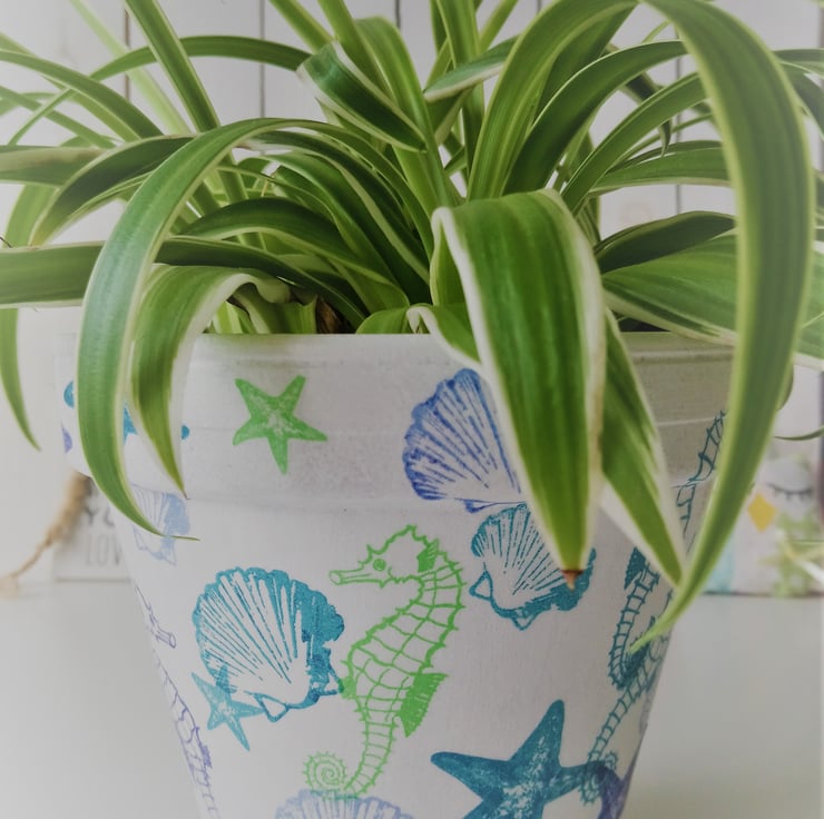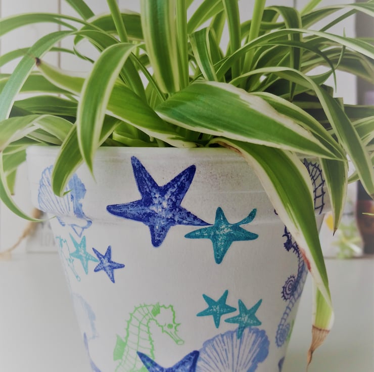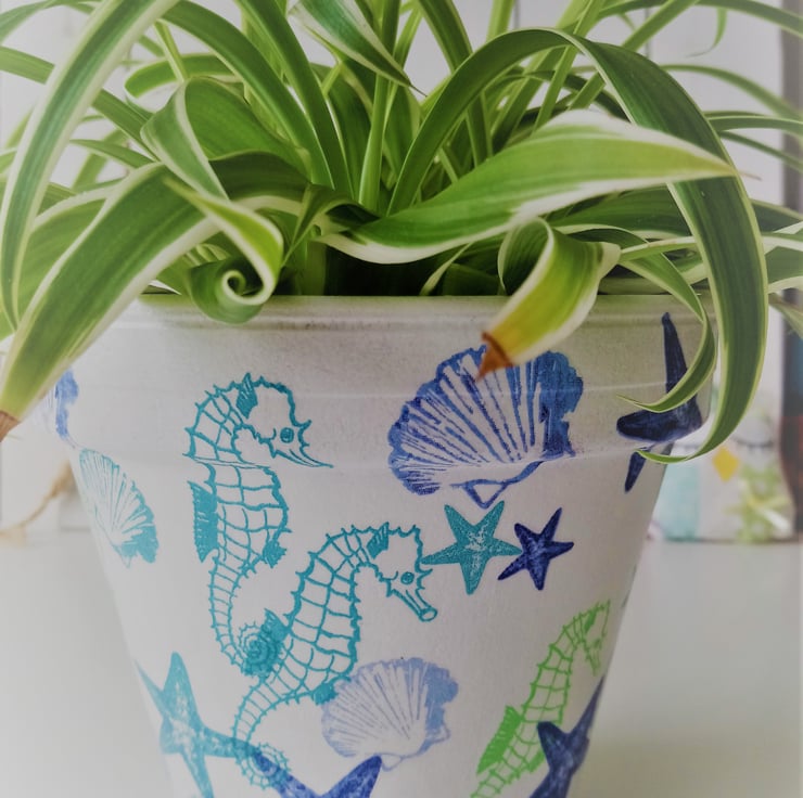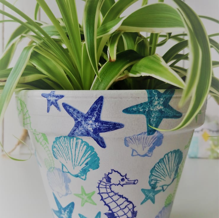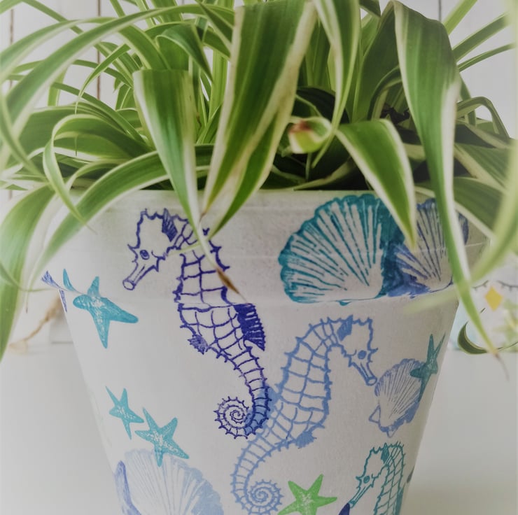 This decoupaged terracotta pot has been decorated with a sea life design of seahorses, starfish and shells on a white painted background. The pot has been painted and varnished inside and out, but I would recommend indoor use only.