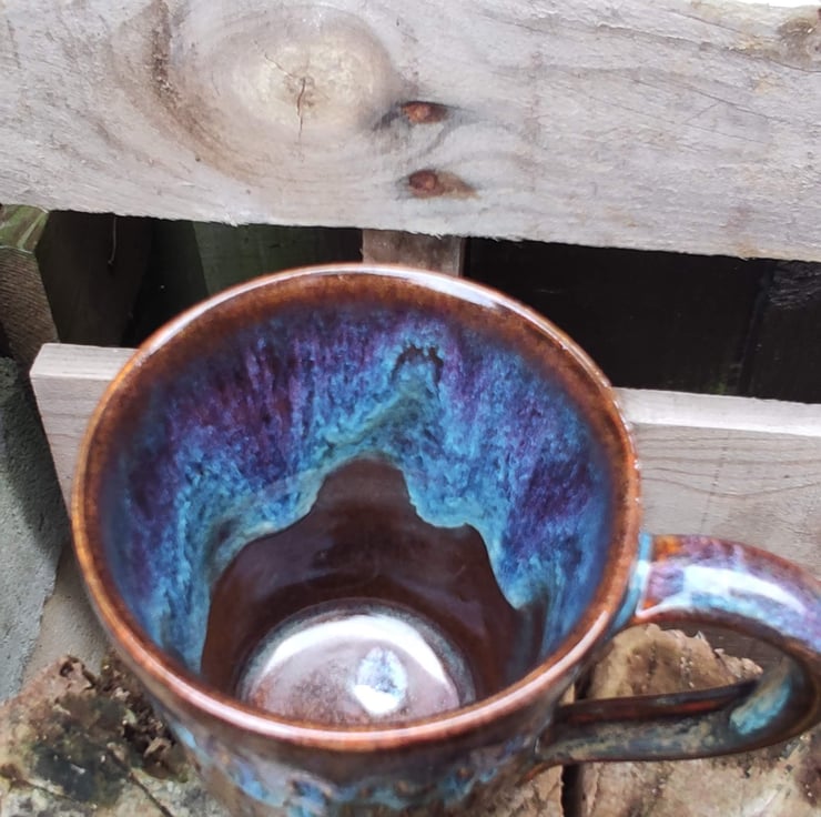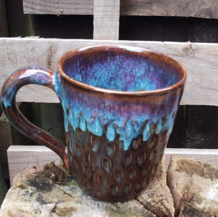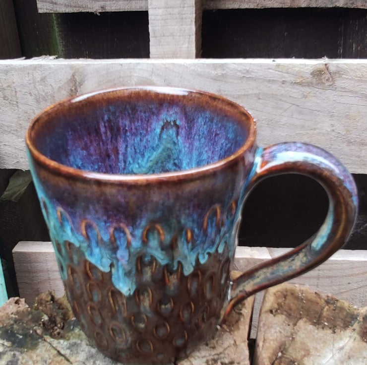 I carved a pattern into this cup and using a couple of new glazes, was pleased with the way the top glaze has brought out a rainbow effect of colours dropping down at the top. Fired to c1200 degrees (stoneware temperature) which makes the cups more durable.