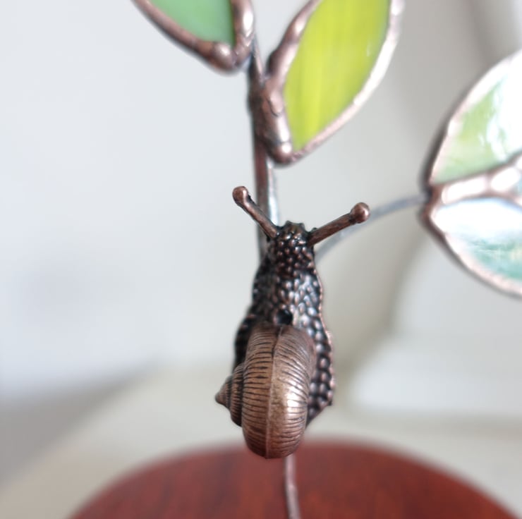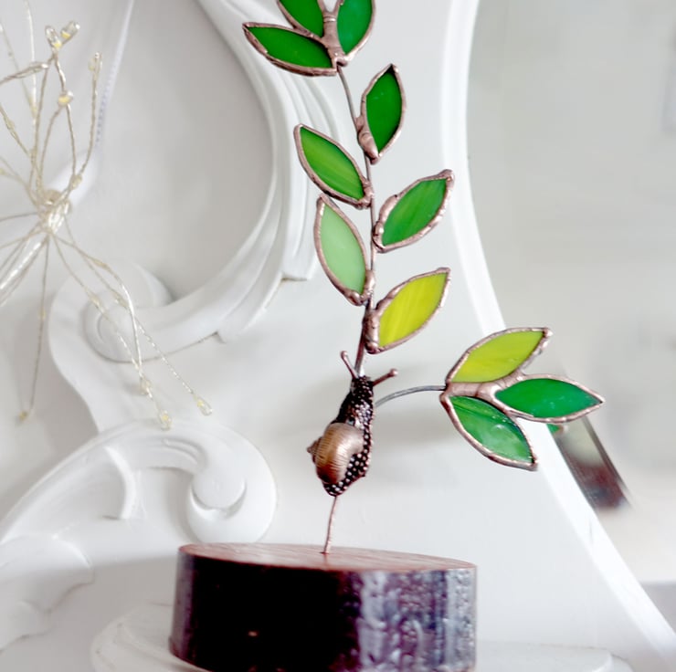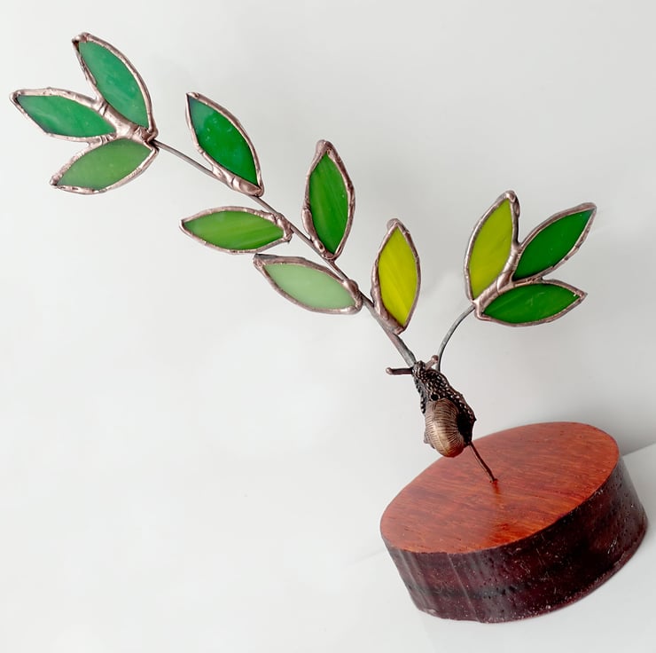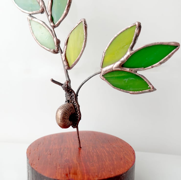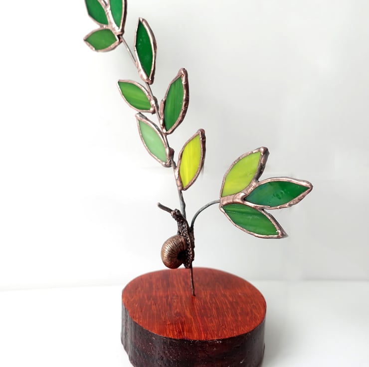 A single stained glass twig and leaves with a tiny copper snail. This stands on an inch thick round of hand turned and finished African Padauk Wood which is known for its vermillion colour.