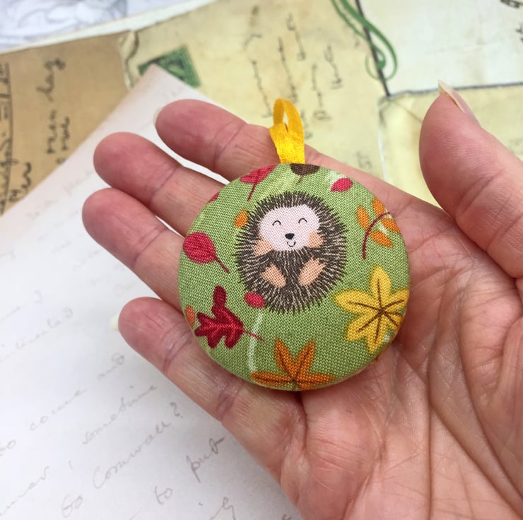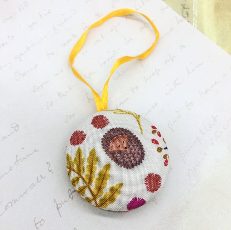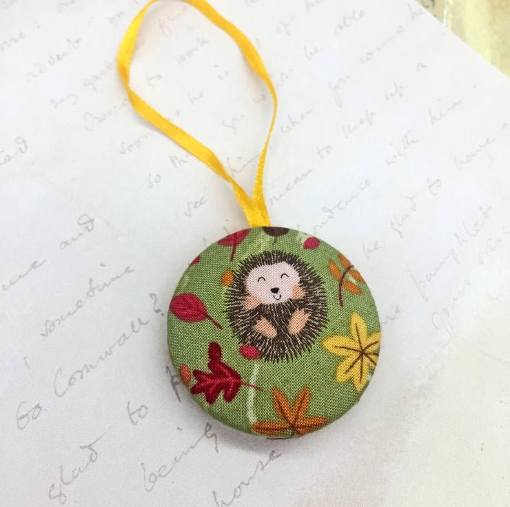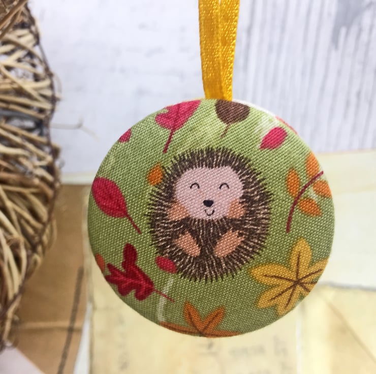 This cute ornament is made from two different 100% cotton hedgehog fabrics, one is a sleeping hedgehog surrounded by mustard foliage on a cream background, the other is a smiling hedgehog on a sage green background with russet leaves.