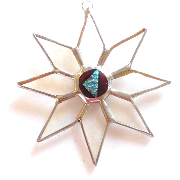I've designed it with 8 diamond shaped points made from sparkly iridescent clear glass and at the centre a gorgeous nugget fused in my kiln with a special dichroic glass topping. The nugget in this star is a lovely Plum colour.