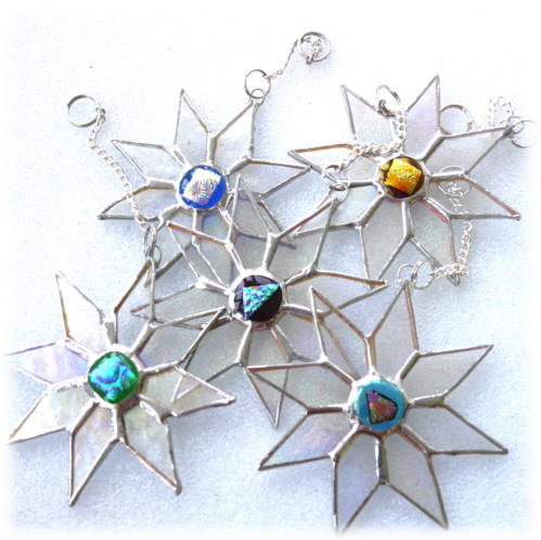 The star is 10 cm in diameter and hangs from a silvery chain attached via a soldered wire ring to the top of the star. I supply it with a suction pad so you can hang it in the window.