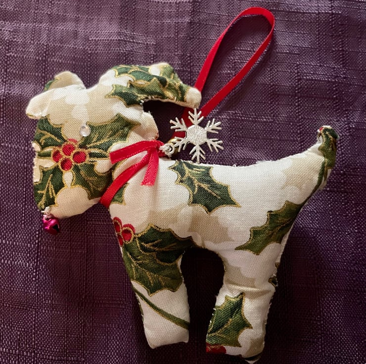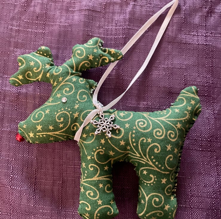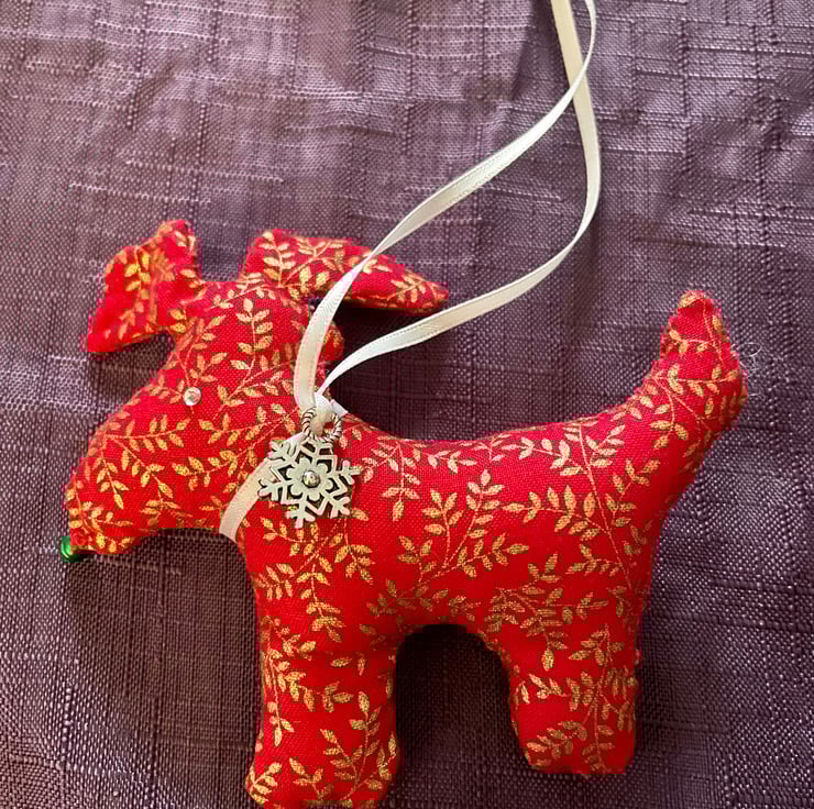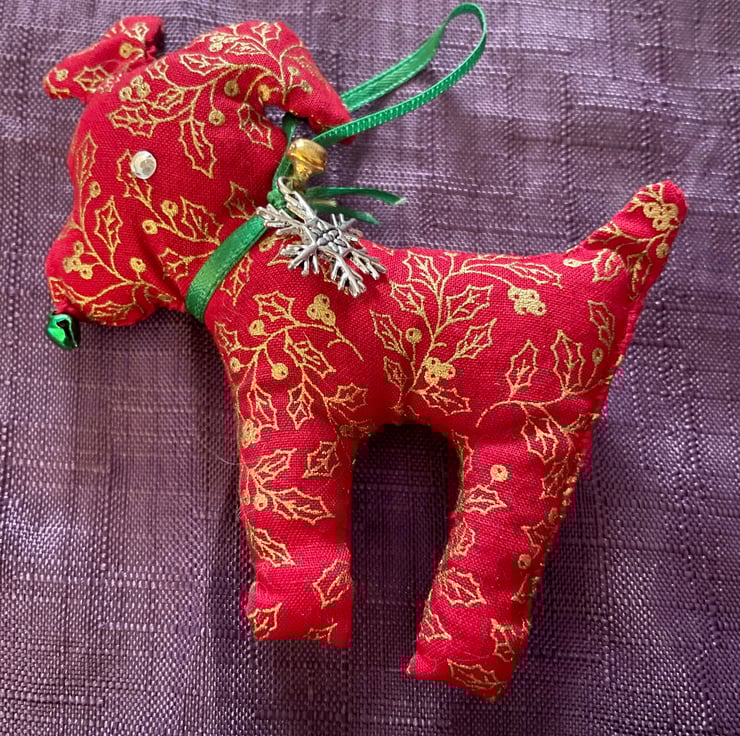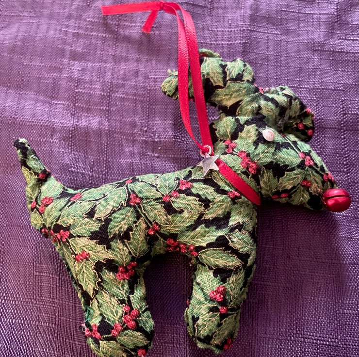 A cute festive little ratty reindeer tree ornament. Made from fabric, padding and finished with a bell, ribbon, bow and charm. Small pieces not suitable for little ones. No bigger than 15cm. Each is unique, please let us know which pattern you’d like from the pictures.