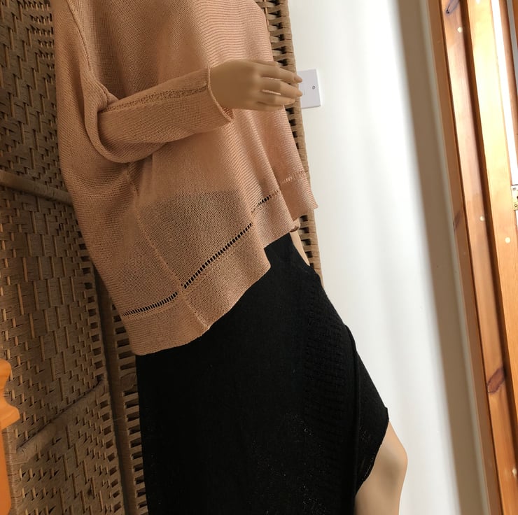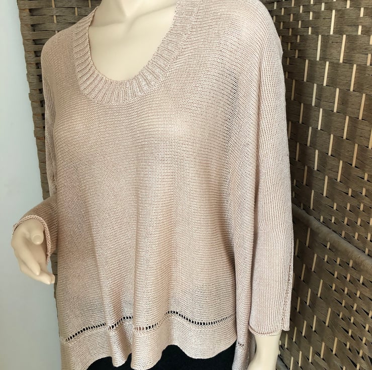 A lightweight machine-knitted Tunic with a fancy detail running up sleeves and around lower hemline.
