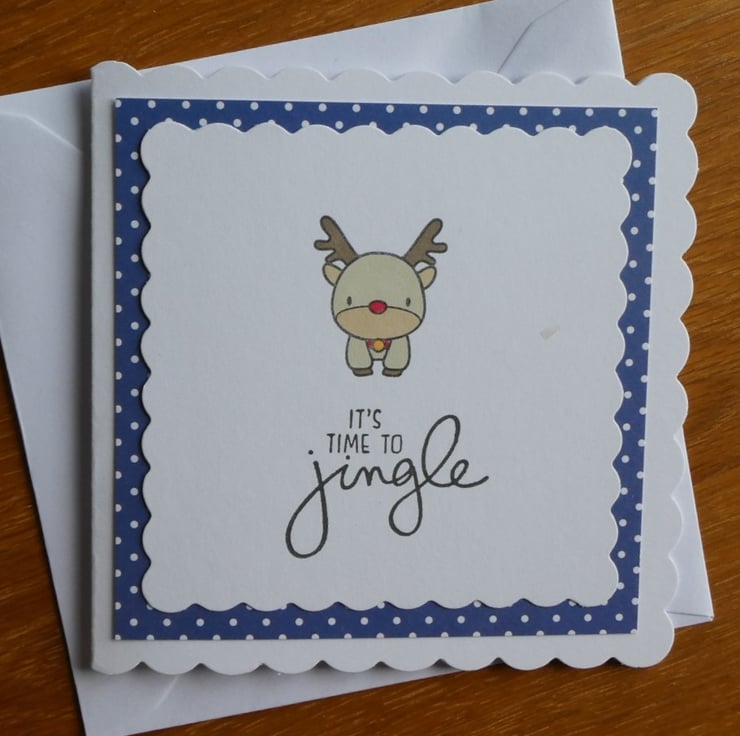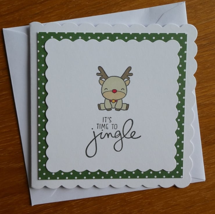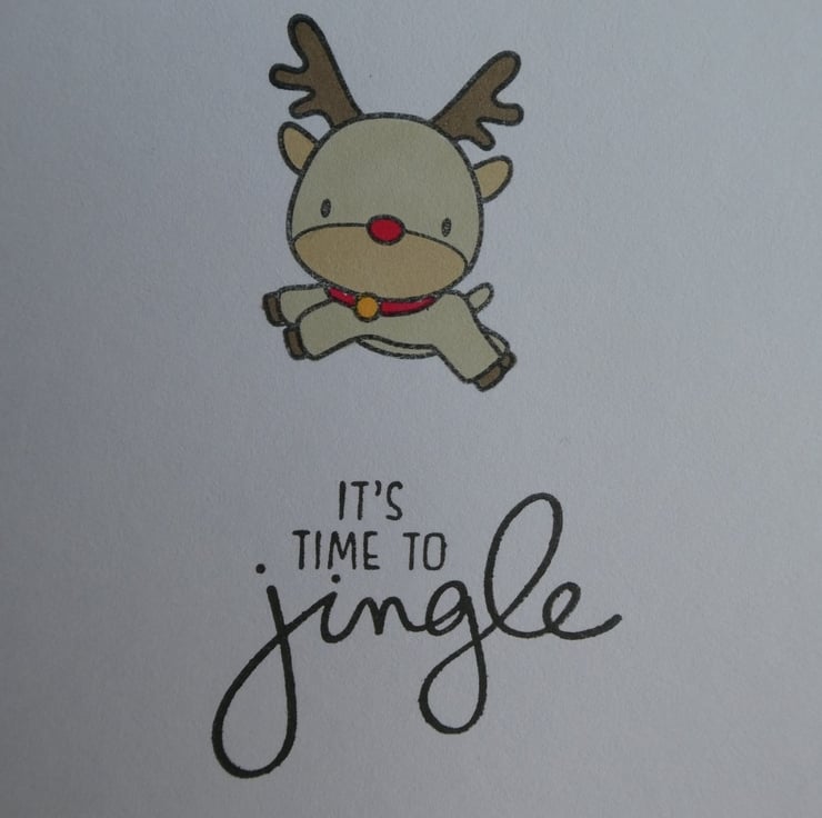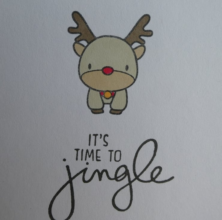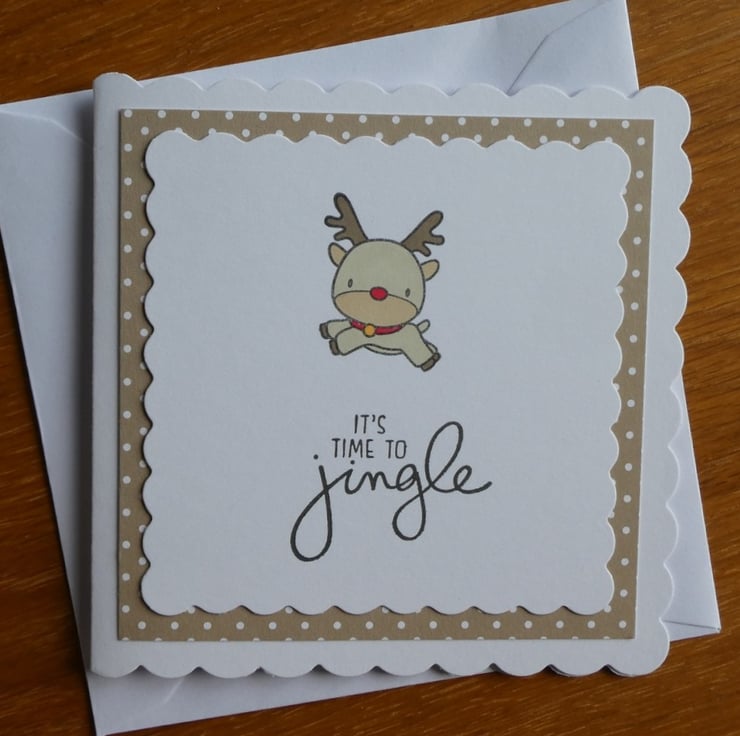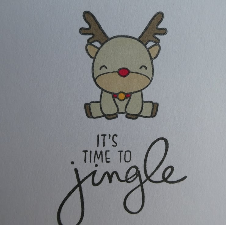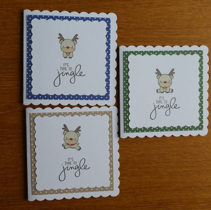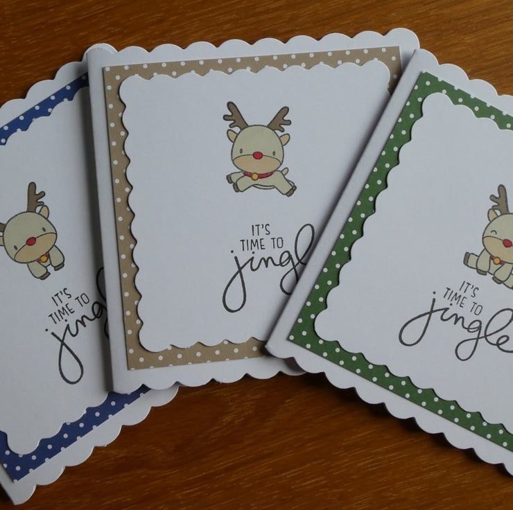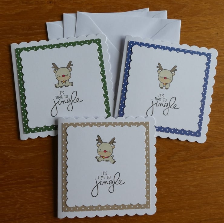 This pack of Christmas cards includes one each of 3 designs featuring cute images of reindeer, each with the message 'It's Time to Jingle' hand stamped below.
