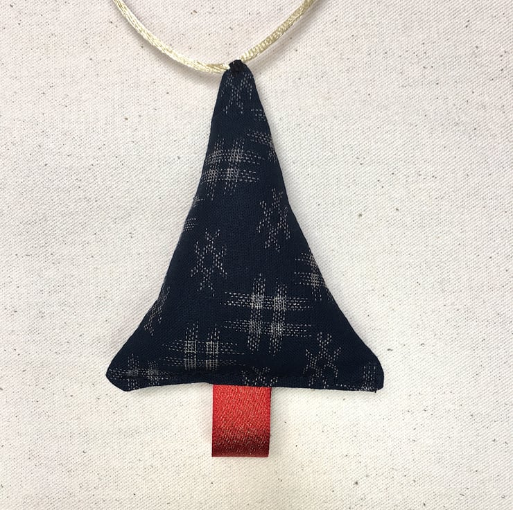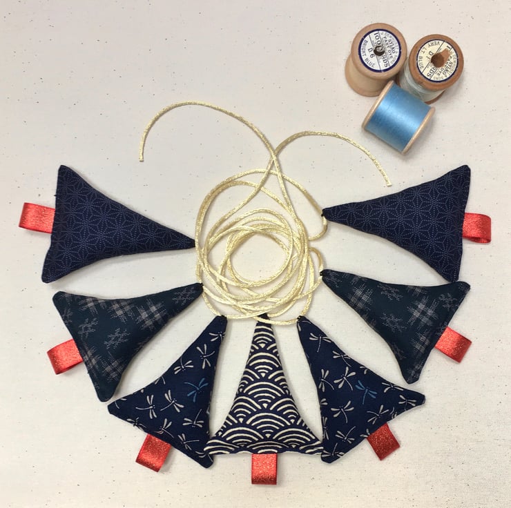 Modern handmade Christmas tree bunting or Christmas garland crafted from indigo Japanese fabrics that can be used year after year.