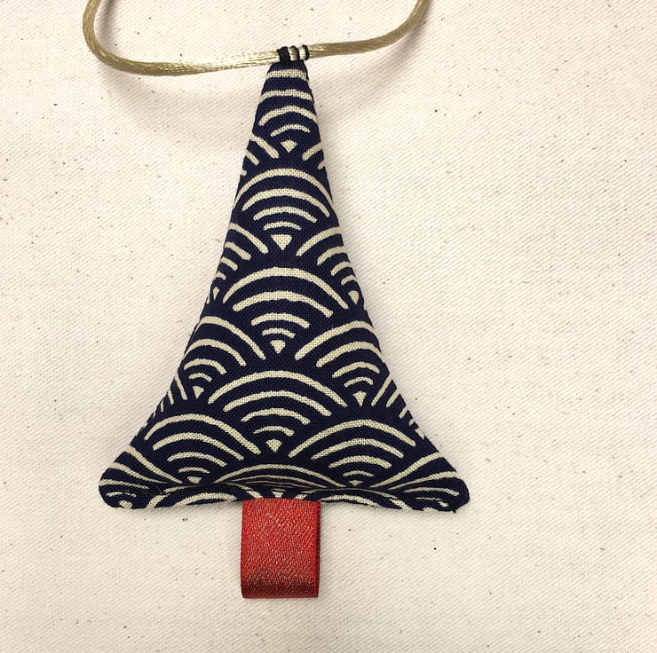 There are seven trees in total that have been created from indigo Japanese fabric, lightly stuffed and attached to gold cord. The trees are spaced 20cm apart and hand on a cord that is a generous 2m in length. The fabric used in these is remnants from other larger projects.