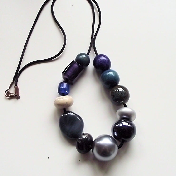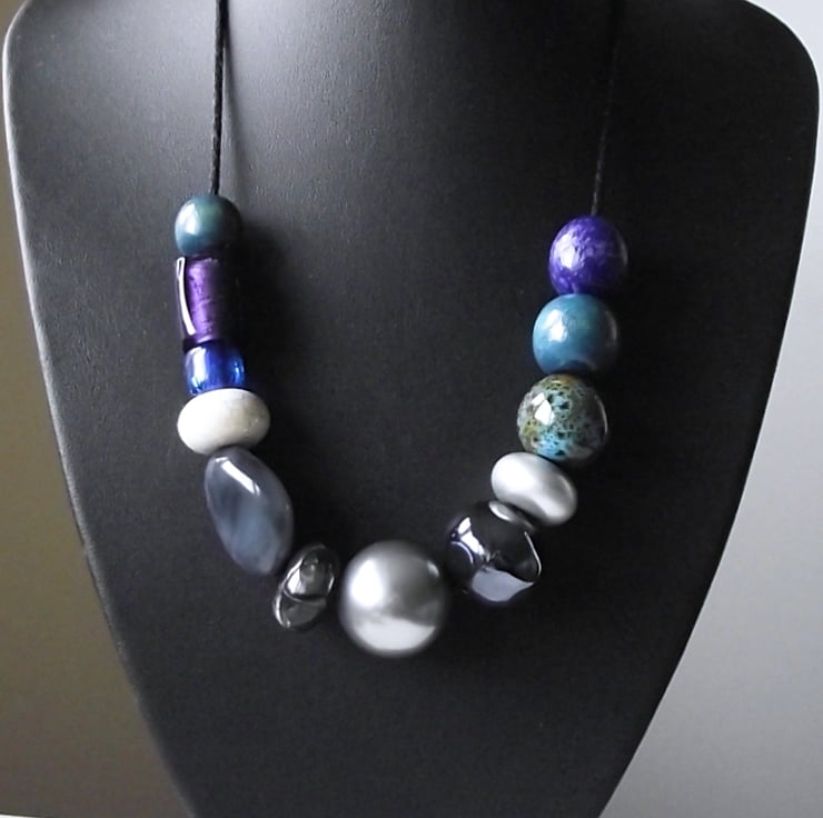Long big bead necklace. Large blue, silver, grey and purple beads. Vintage and modern recycled acrylic, ceramic, wooden and glass beads. Threaded on black nylon cord with antiqued copper clasp. Necklace length approx 80cm. Largest bead 20mm.