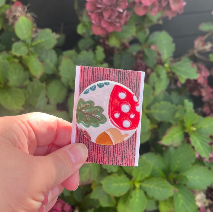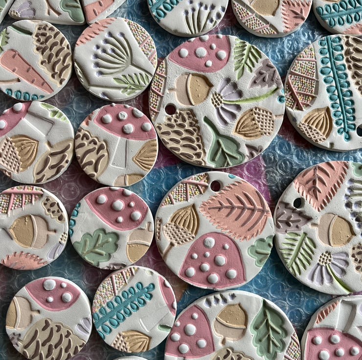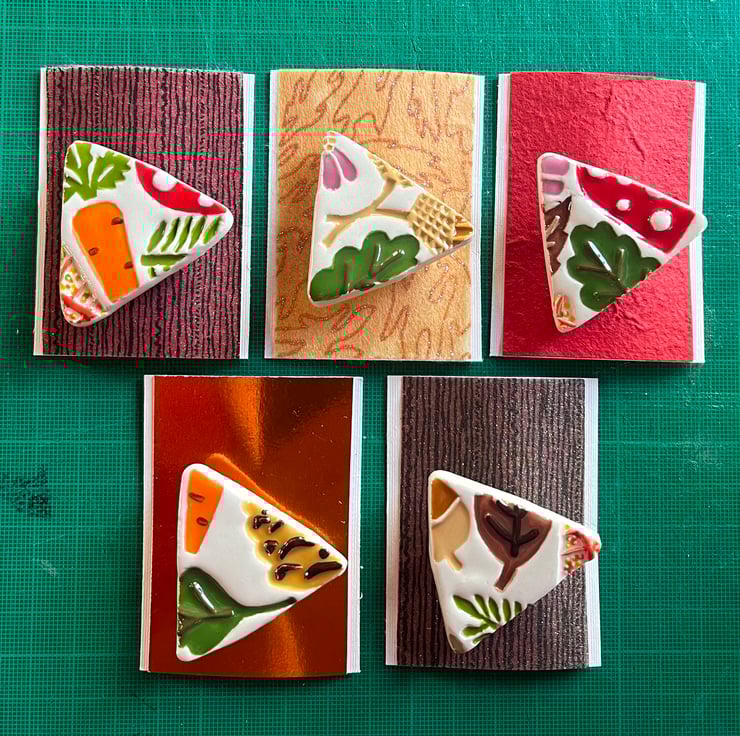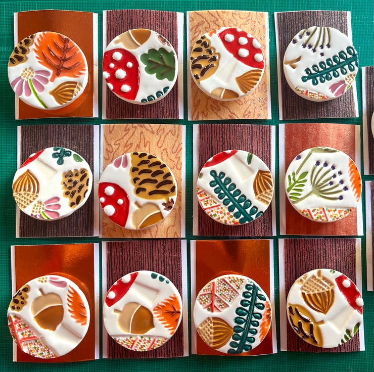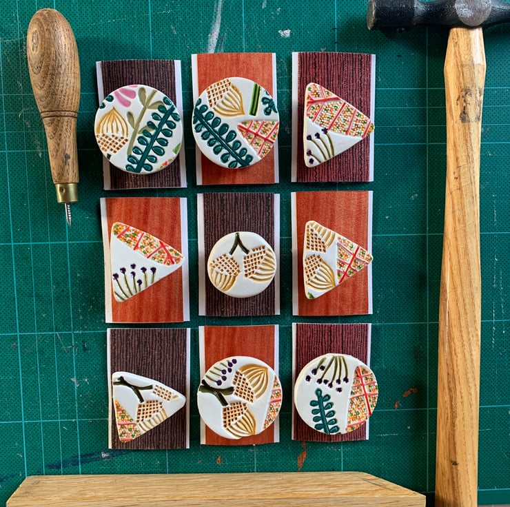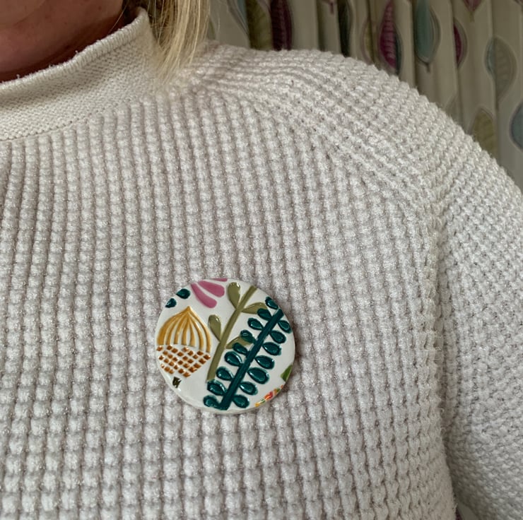 Next to the fun bit, applying colour! I hand paint each brooch using a combination of autumnal coloured underglazes. Before dipping in a glossy transparent glaze and firing for the final time. A brooch pin is then attached to each piece and ta-da it’s ready to wear!