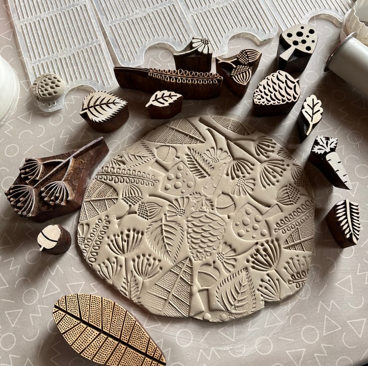 Made from white earthenware clay, this series of textured brooches are handmade from start to finish. Initially texture is applied to the surface of the clay using a series of decorative Autumnal wooden blocks. Each piece is then air dried for several days before being kiln fired to form bisqueware.