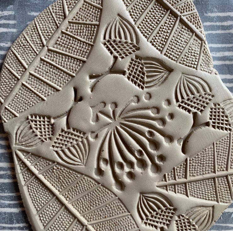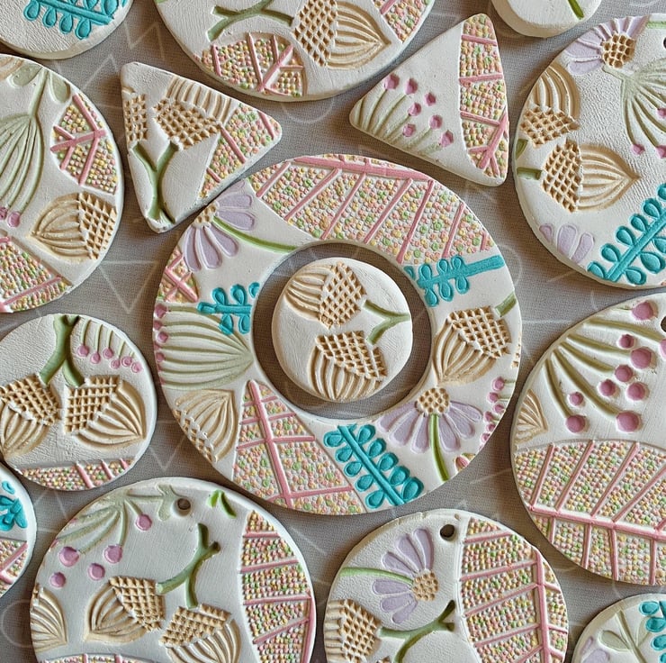 Made from white earthenware clay, this textured brooch are handmade from start to finish and one of a kind. Initially texture is applied to the surface of the clay using a decorative wooden block with an acorn design. Each piece is then air dried for several days before being kiln fired to form bisqueware.