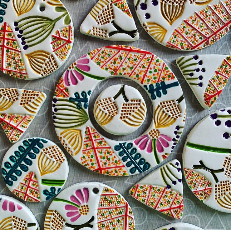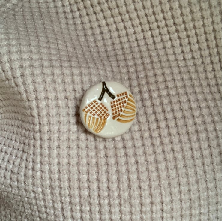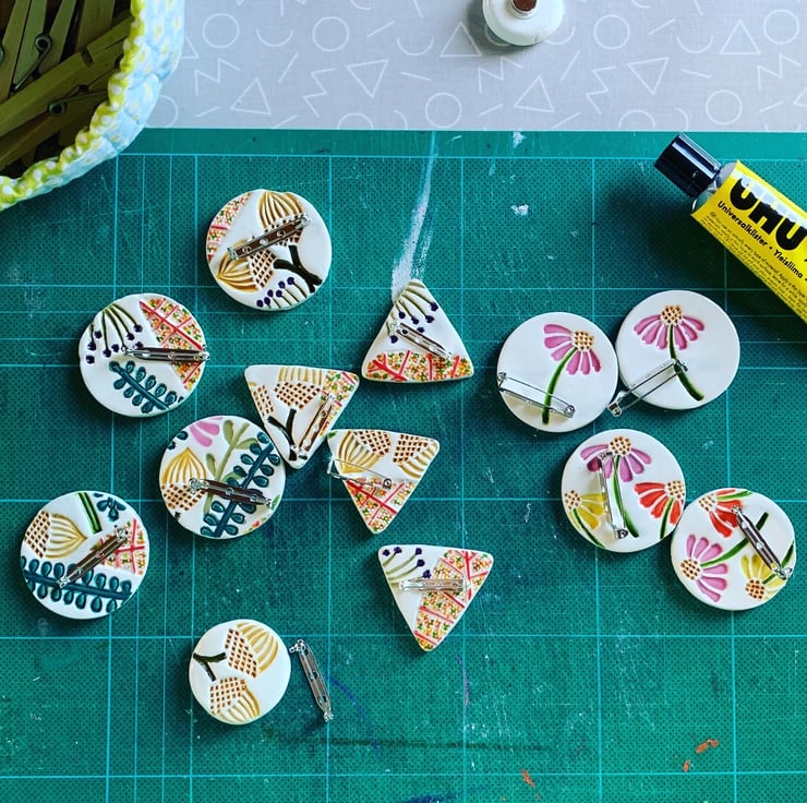 Next to the fun bit, applying colour! I hand paint each brooch using a combination of autumnal coloured underglazes. Before dipping in a glossy transparent glaze and firing for the final time. A brooch pin is then attached to the reverse and ta-da it’s ready to wear!