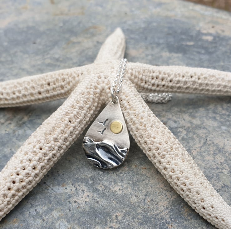 Perfect for anyone who loves to be by the seaside. Measuring approx 28mm high and 20mm across at it's widest point, it is handmade in sterling silver with a layer of folded fine silver to represent the sandy beach. It has a little brass sun and 2 stamped seagulls flying in the wind.. The pendant has been oxidised to give the effect of a hazy sky. It comes complete with a sterling silver belcher chain which fastens with a lobster clasp.