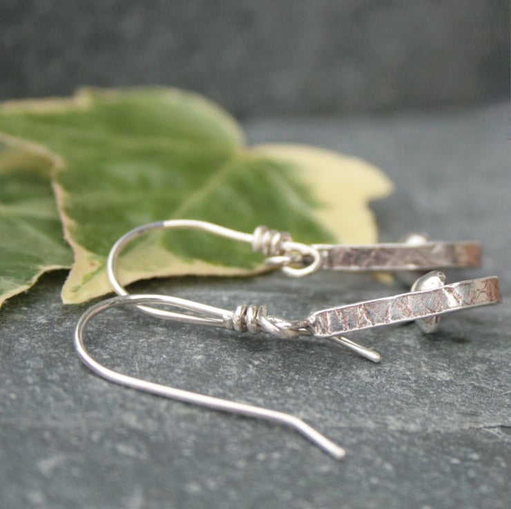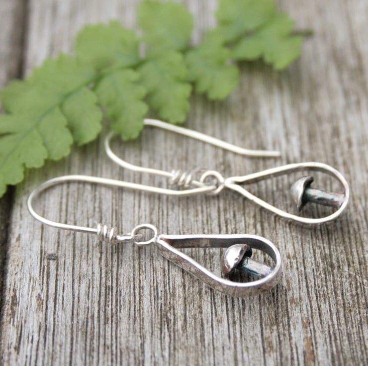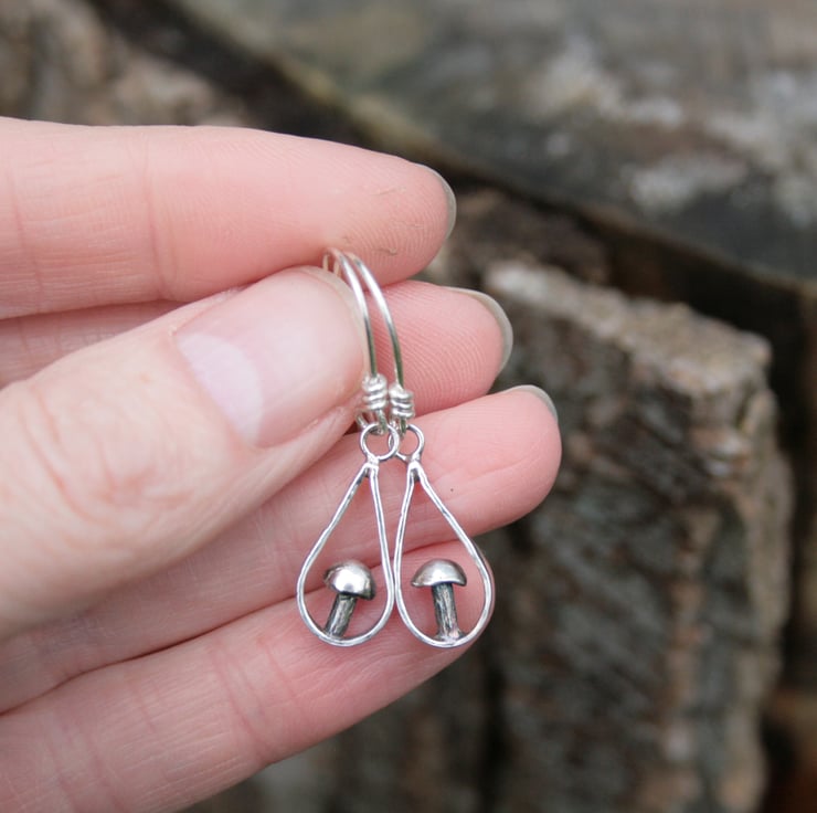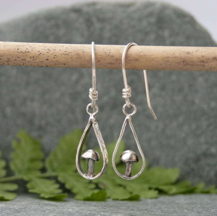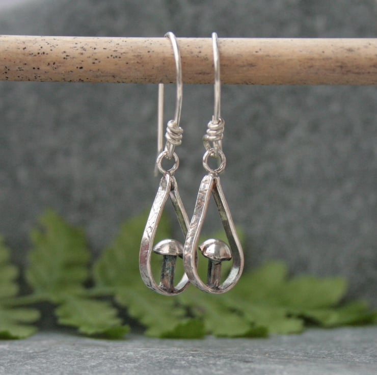I have handmade them from sterling silver. The design has a little toadstool sitting within a teardrop shaped frame with a textured edge. The surface of the silver has been darkened to enhance the pattern and give a more woodland feel to the earrings.