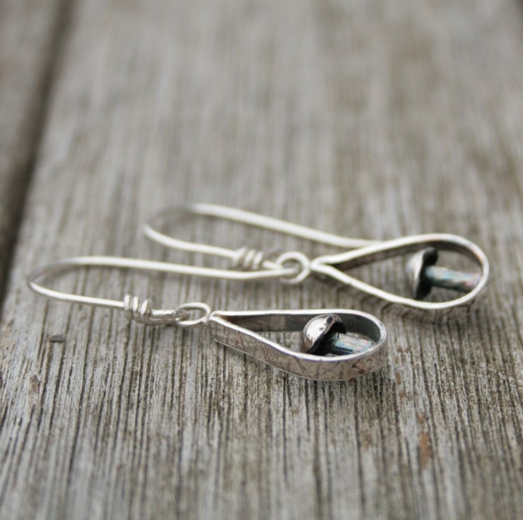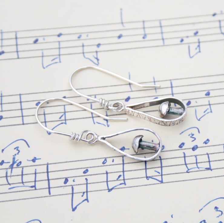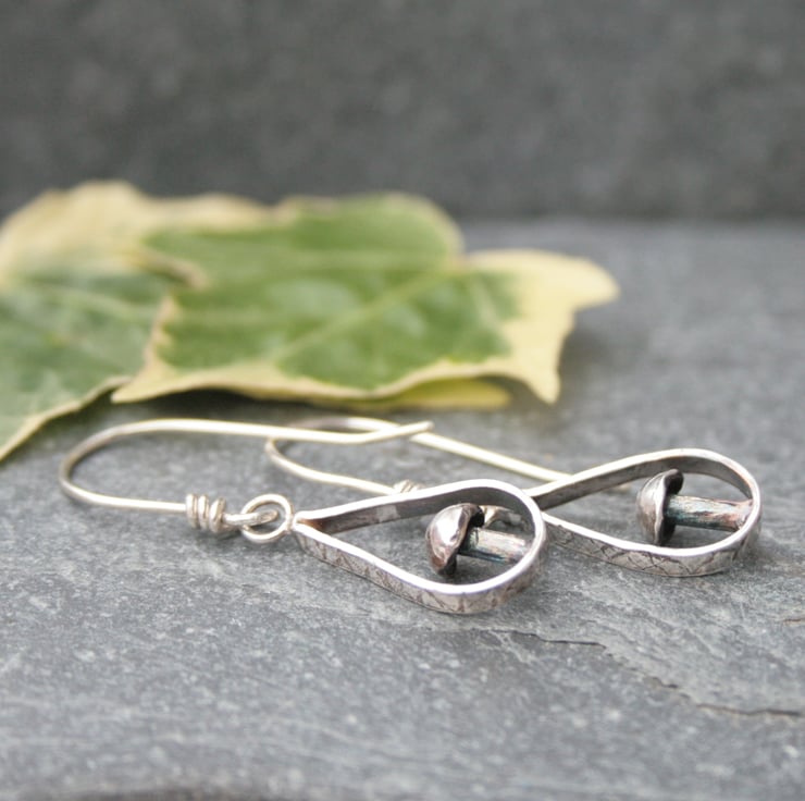 I have handmade them from sterling silver. The design has a little toadstool sitting within a teardrop shaped frame with a textured edge. The surface of the silver has been darkened to enhance the pattern and give a more woodland feel to the earrings.