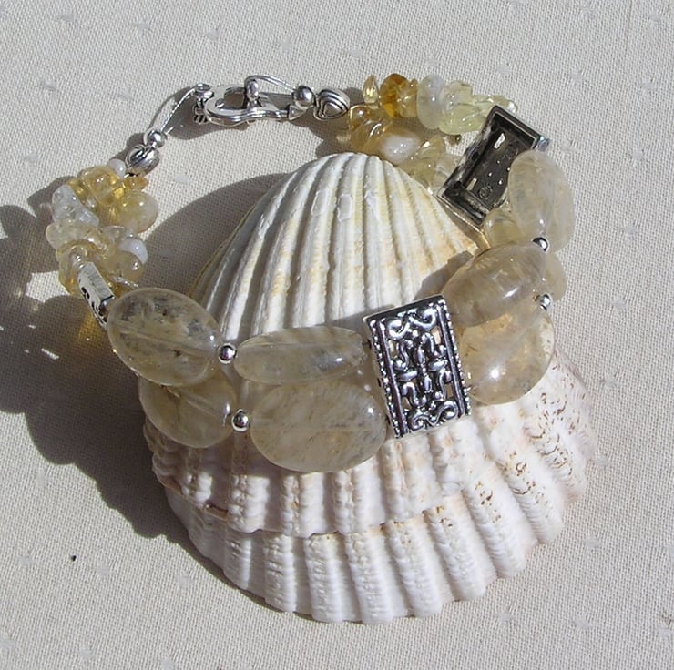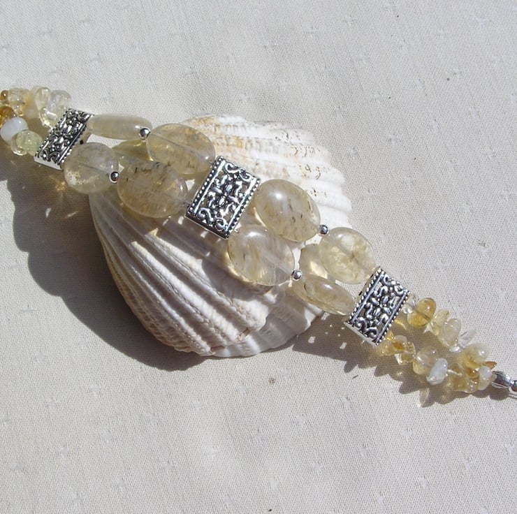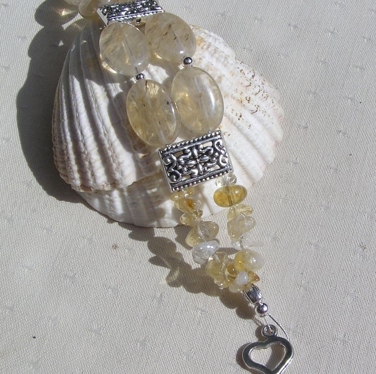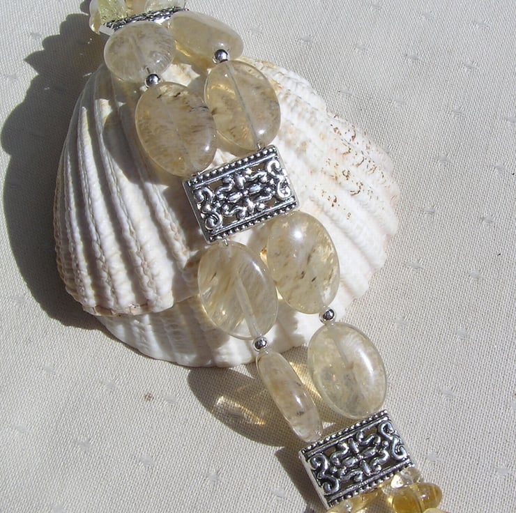 This Stunning Bracelet is made from Yellow Tourmaline puffy oval Beads alternated with sparkling tiny Silver spacers teamed together with Citrine Gem-Chips… each section separated by an ornately decorated Tibetan Silver Bar Spacer with a tiny Silver Heart at each end - a Beautiful combination that will look stunning either worn casually or with something more Elegant for a Special Evening out