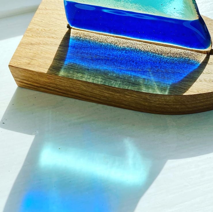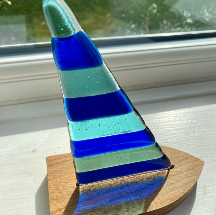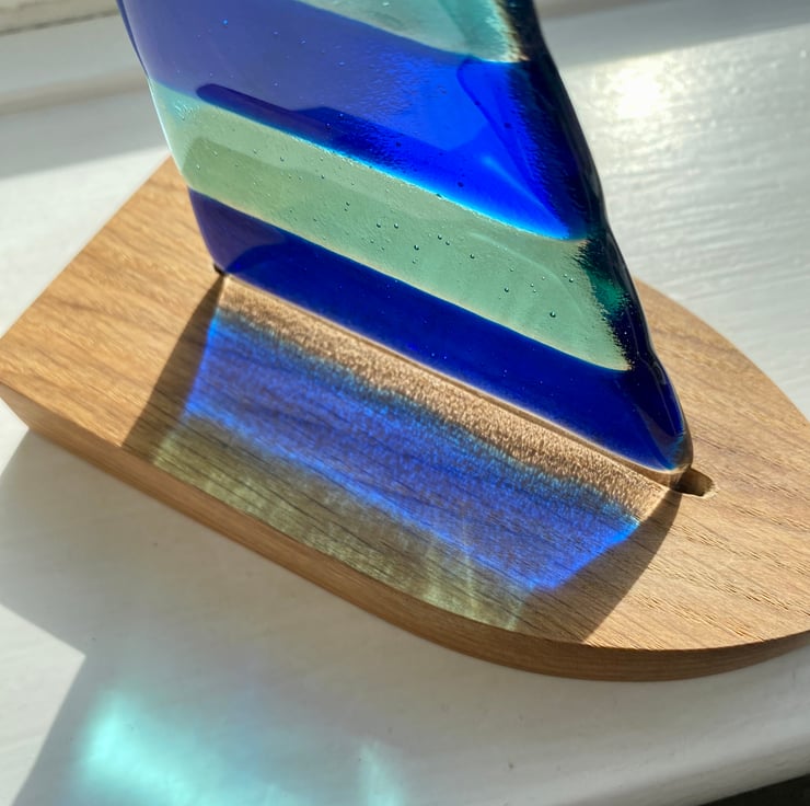 A fused glass sail with bright blue and turquoise stripes sits in a beautiful solid oak boat-shaped stand.
