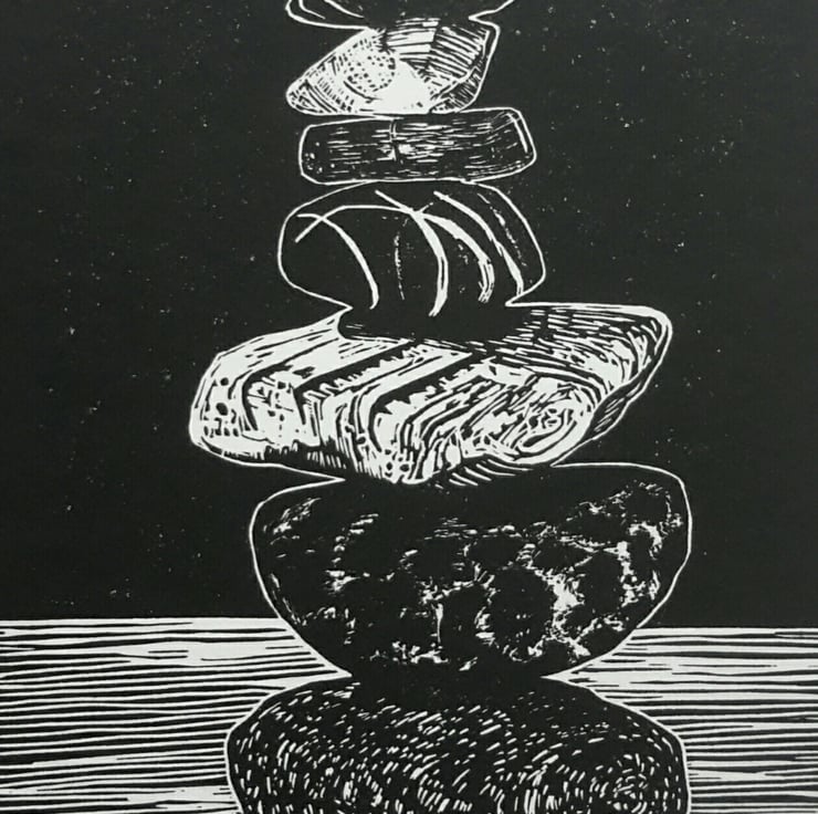 I think we all have a small pebble collection a little reminder of our holidays. The Yorkshire and Cornish coasts have some of my favourites spots. Memories of the pebble stacks adorning the beaches led me to create my own, which i captured in a sketch followed by this linoprint. I hope it evokes some happy memories for you too.