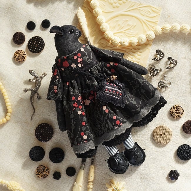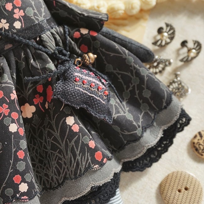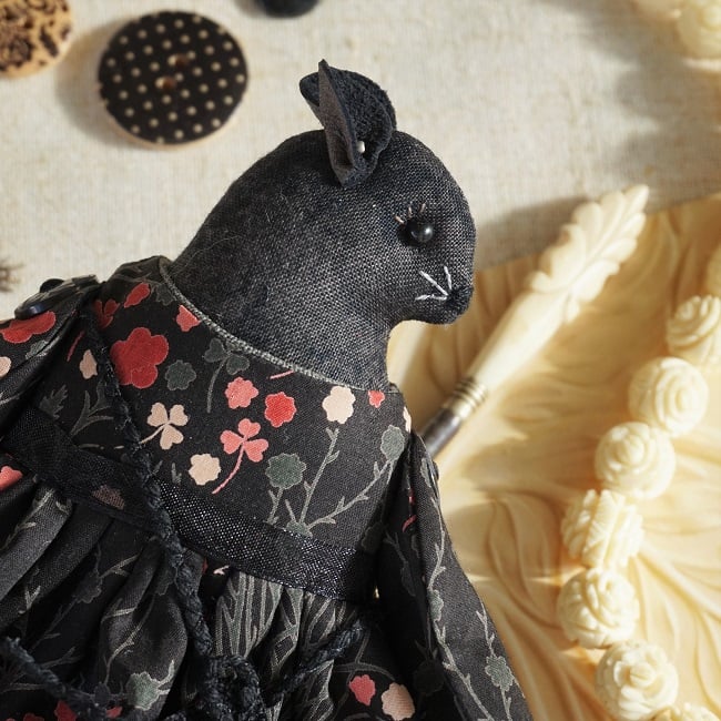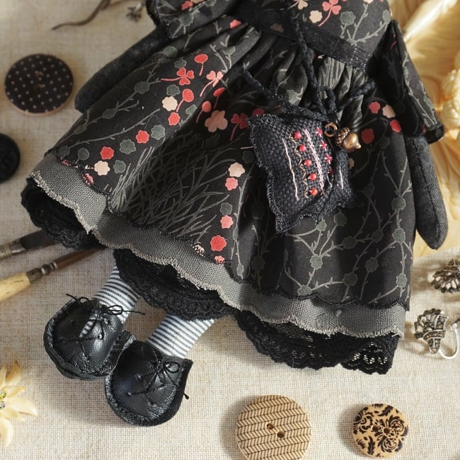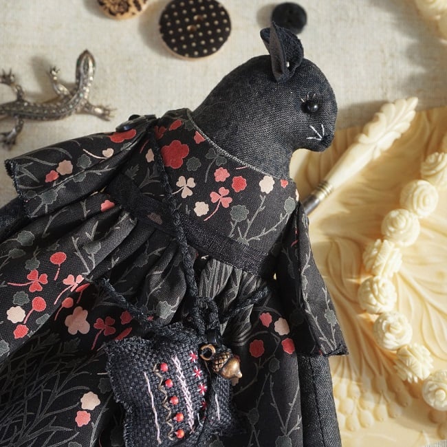 This is Cleda, a tiny midnight mouse. She is a hand embroidered mouse with little leather ears and tail. She is dressed in a Liberty tana lawn cotton called Penderghast, the midnight version, a black ground with pencil crayon wild flowers in coral and bright red. She has coordinating underskirts in warm grey Essex Linen, black tulle mesh and cream cotton lace bloomers. Her dress is finished with organza ribbon, tiny buttons and little leather shoes. She is a black mouse with black ears and tail, grey wishkers and an embroidered black nose.
