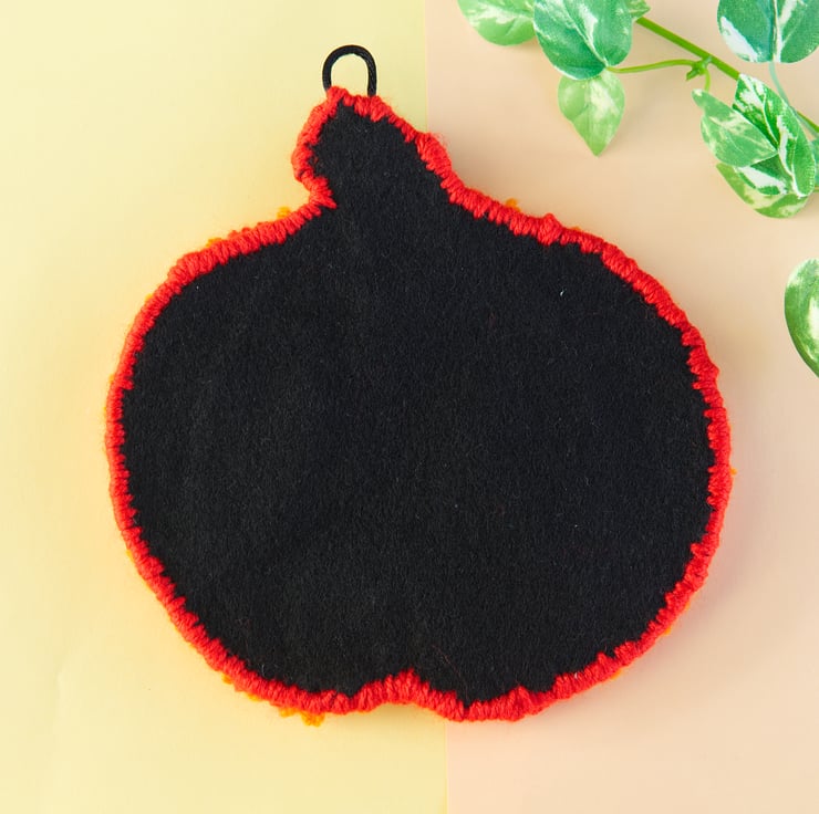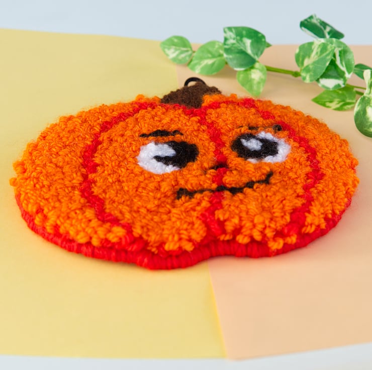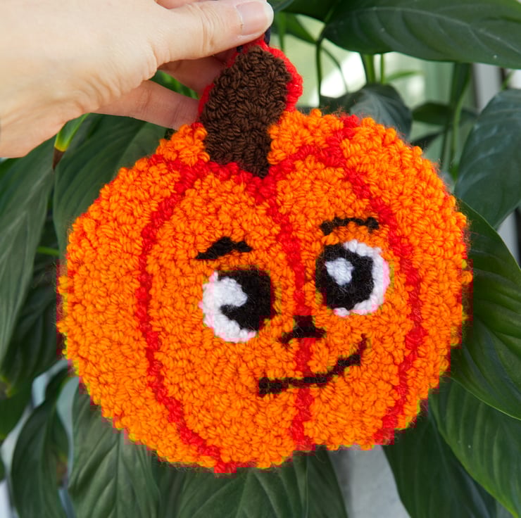 A hand punched tufted wall hanging of a little Jack O' Lantern pumpkin, perfect for a cuter Halloween decor theme. The piece has been made using a technique called punch needle using 100% acrylic yarn. It has been backed with felt and finished round the edge with a whip stitch. A loop has been attached for easy hanging too. It would make a perfect decoration for a kids room at Halloween.