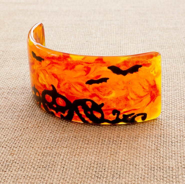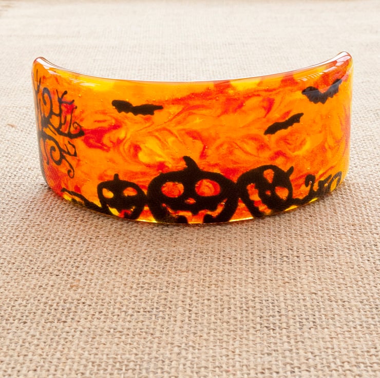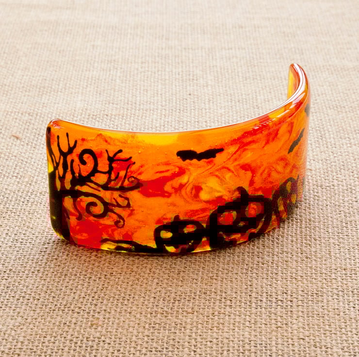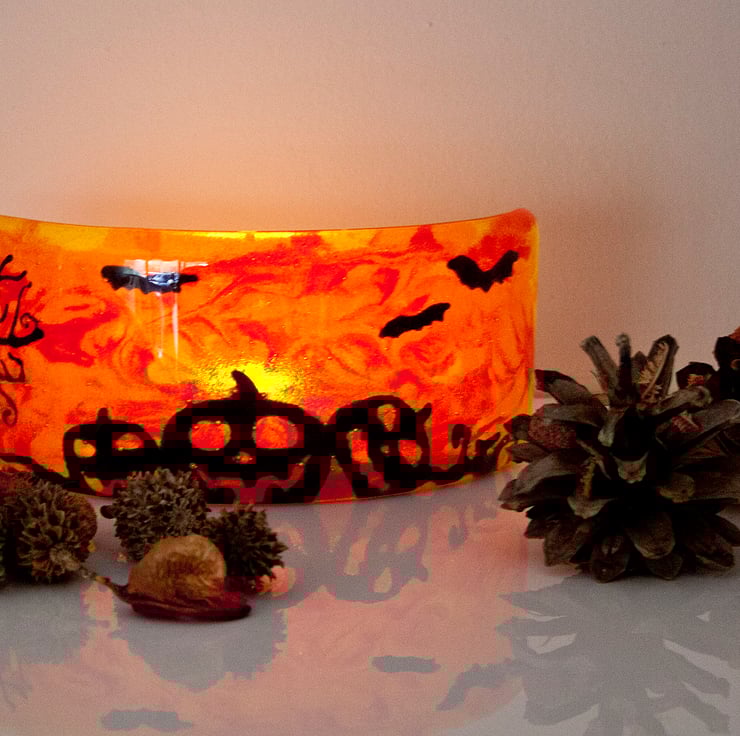 A handmade curved glass picture that looks great in front of a window or a candle. It's individually made using powdered glass to get the colourful background and the black silhouettes are handpainted.