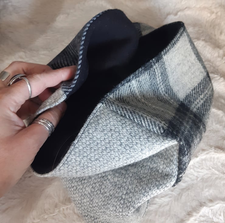 This handmade snood is created using a patchwork of tweed and wool in grey and blue tones. The scarf is lined with soft, cosy black polar fleece and is top stitched to prevent rolling. There are more colours in my shop - please take a look.