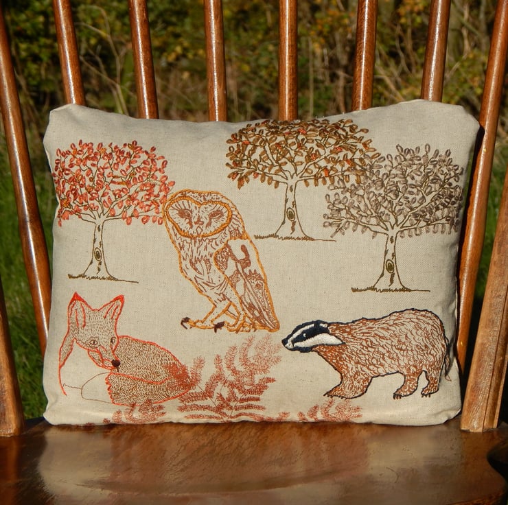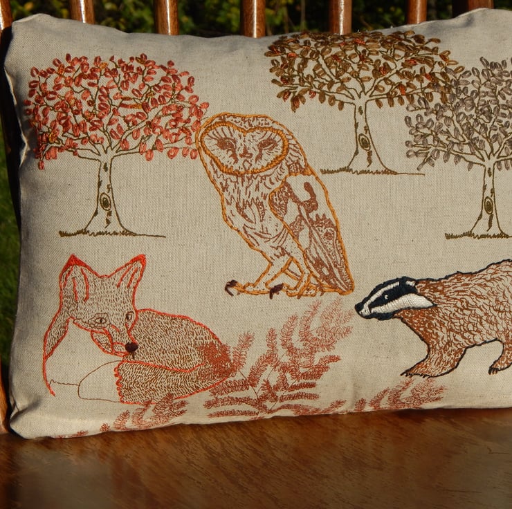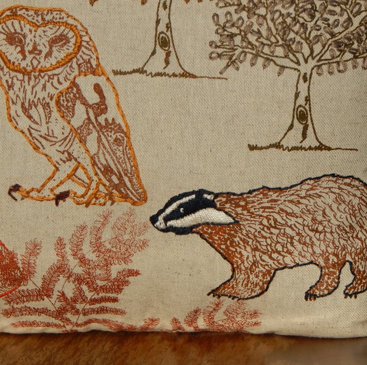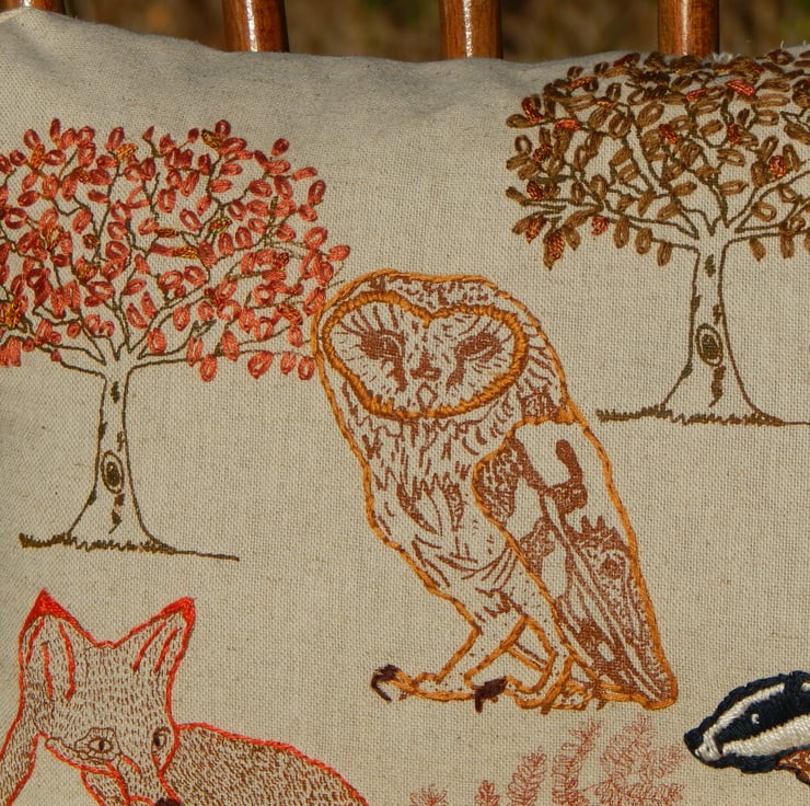 This is a beige medium weight cotton cushion that has been screen printed with my own designs. Many have been individually printed which involves positioning, printing an individual flower, drying and then repeating. This gives you an absolutely one off, designed cushion. There is a Barn Owl, Fox and Badger with trees and Bracken. The reverse of the cushion is a beige to match fabric, in an envelope style with 3 plastic poppers to stop gaping. The edges of the animals have been hand embroidered for a pop of texture and colour. The trees have hand embroidered leaves.