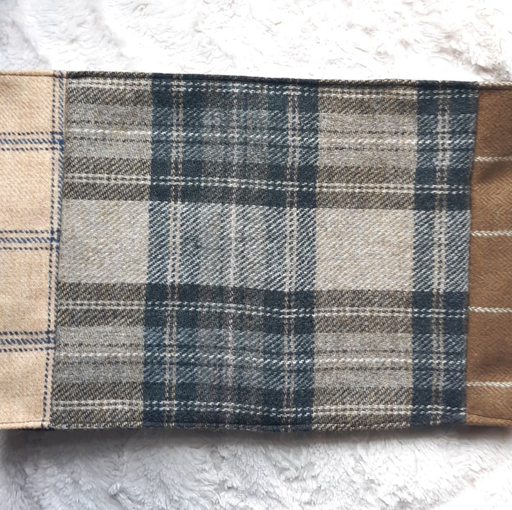 This handmade snood is created using a patchwork of tweed and wool in mustard, yellow and blue/grey/brown tones. The scarf is lined with soft, cosy black polar fleece and is top stitched to prevent rolling. There are more colours in my shop - please take a look.