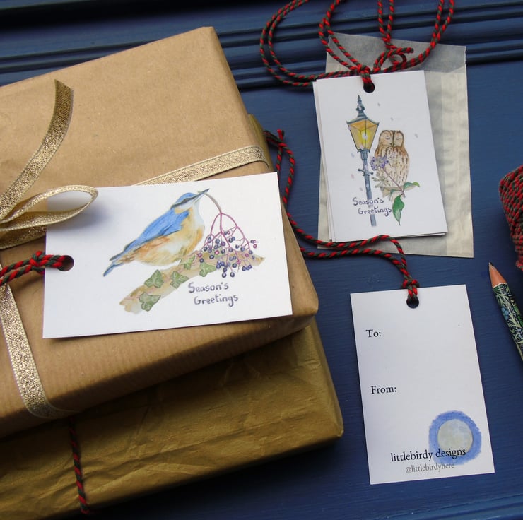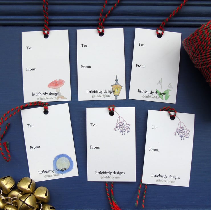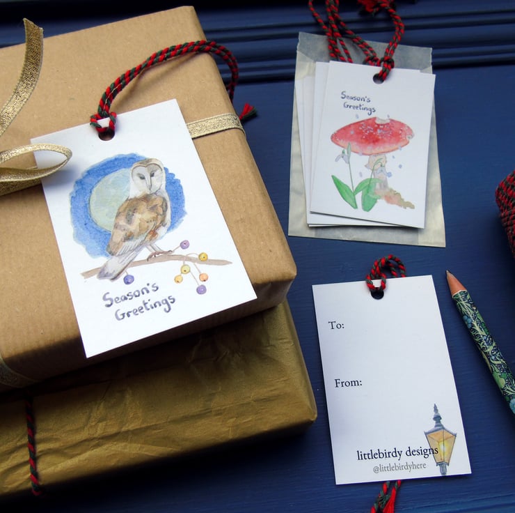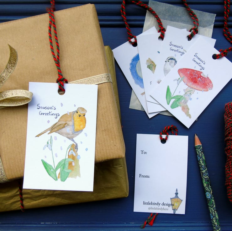 A set of nature themed Christmas gift tags to add an extra special, inexpensive personal touch to your wrapping featuring my watercolour paintings of seasonal birds, berries and toadstools.