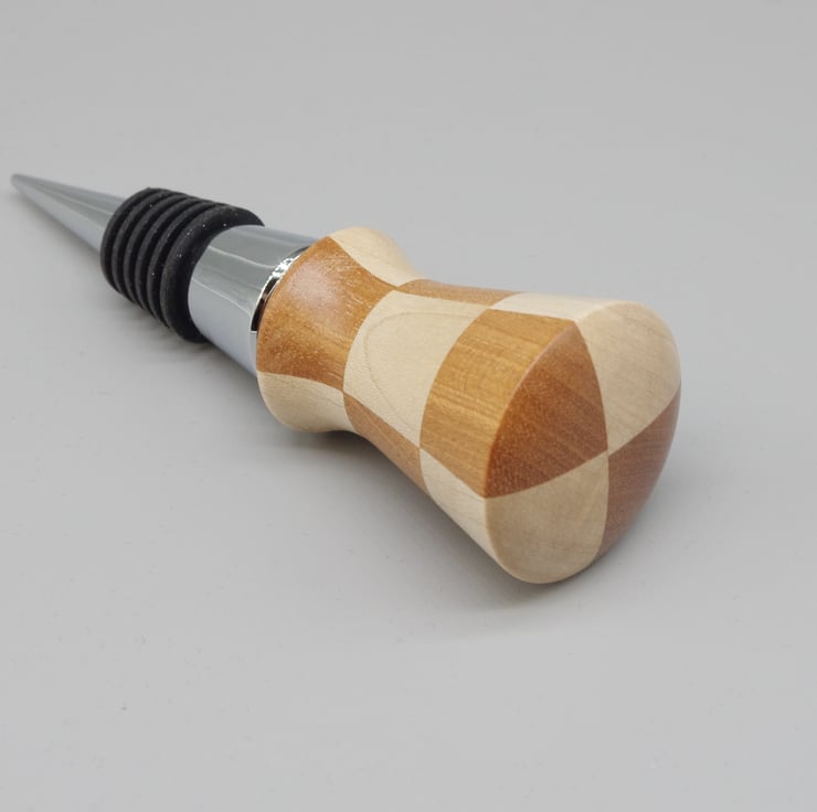 This handsome hand-turned bottle stopper is made from Sycamore and Mahogany.