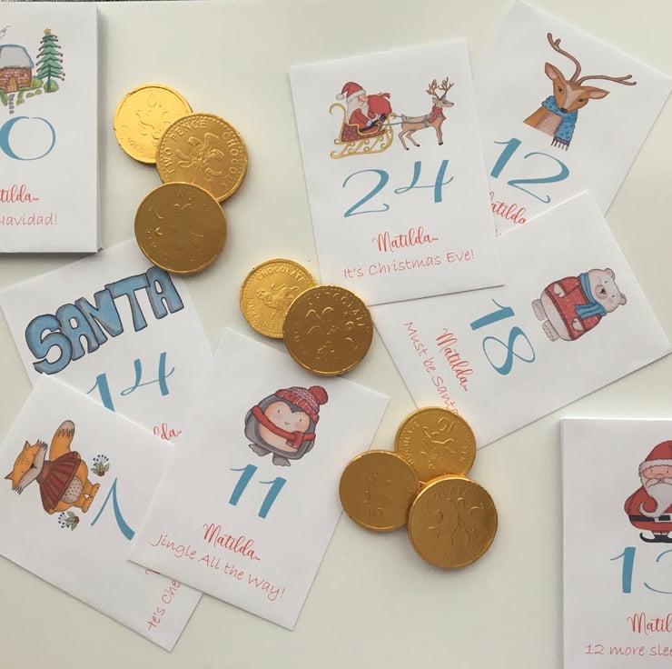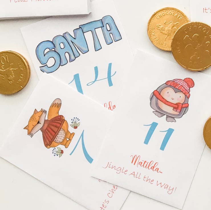24 personalised advent calendar envelopes each with a different Christmas saying and finished with a personalised sticker to seal the back of each envelope. These envelopes are so fab as they give you the flexibility to really have some fun with the little daily treats Advent Calendars provide in the run up to Christmas. Full with chocolate coins, sweeties, key rings, small jewellerey items, make up - the options are endless!