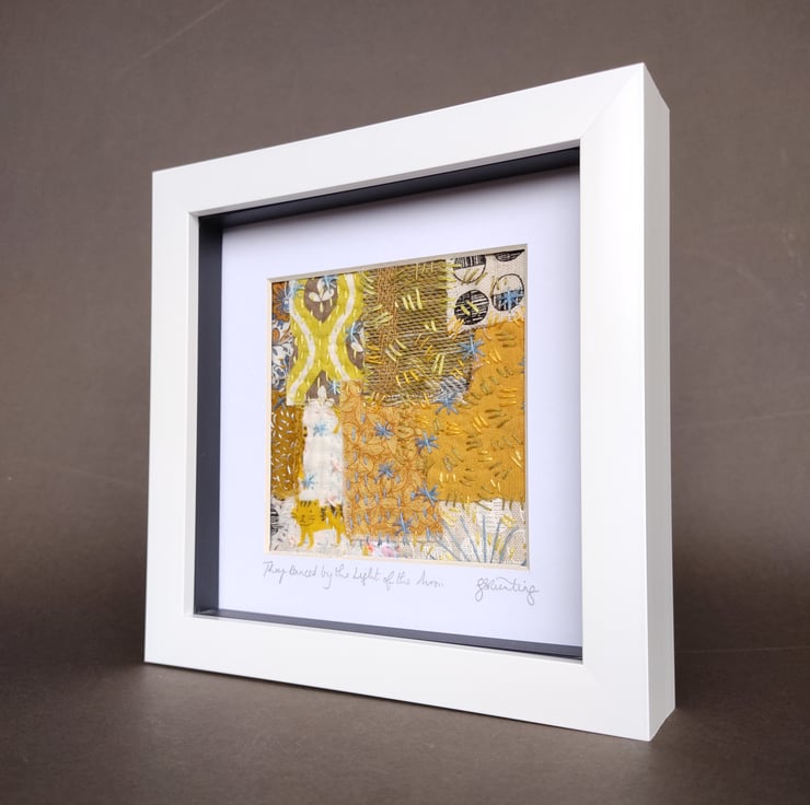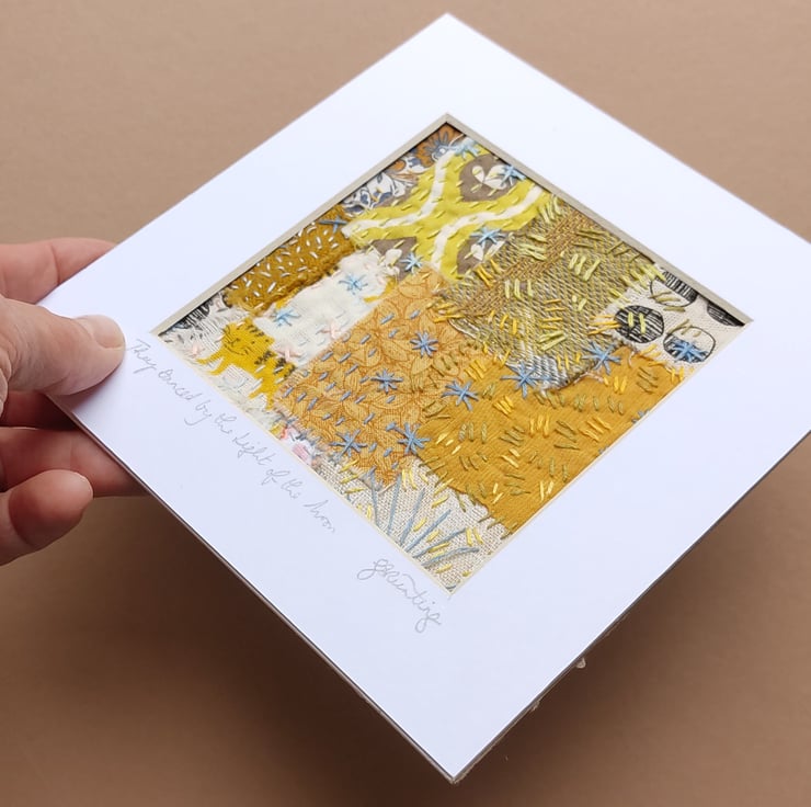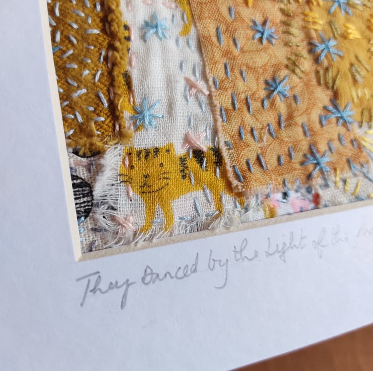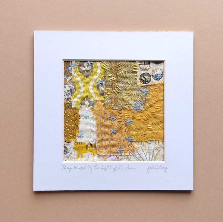 "They Dance by the Light of the Moon" is a unique handstitched and embroidered fabric collage. Its title is a line taken from one of my favourite poems, "The Owl and the Pussycat". Its harvest colour palette makes it an ideal partner work to "Flax Seeds", also available in my shop.