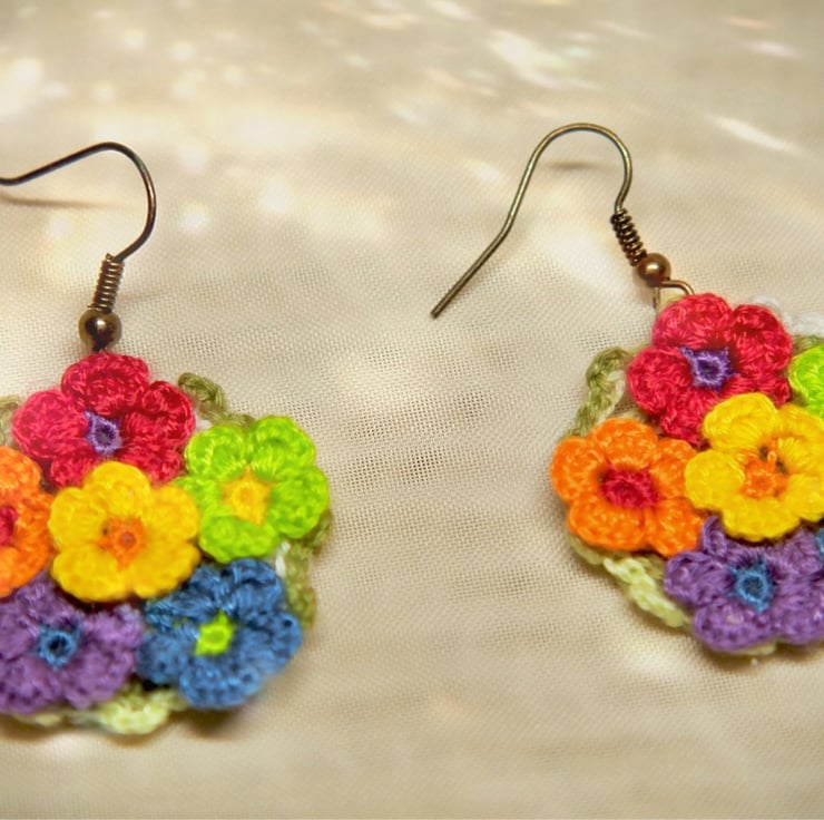 Colorful Microcrochet floral earrings made with Embroidery Threads.